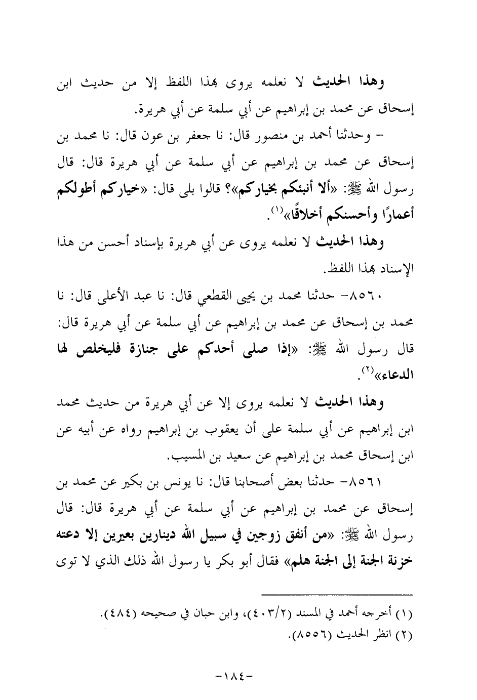 8561- حَدَّثنا بعض أصحابنا، قَال: حَدَّثنا يونس بن بكير عَنْ مُحَمد بْنِ إِسْحَاقَ، عَن مُحَمد بْنِ إبراهيم، عَن أبي سَلَمَة، عَن أبي هُرَيرة، قَالَ: قَالَ رَسُول اللهِ صَلَّى اللَّهُ عَلَيه وَسَلَّم: من أنفق زوجين في سبيل الله دينارين بعيرين إلاَّ دعته خزنة الجنة إلى الجنة هلم فقال أَبْو بَكْر يا رسولَ اللهِ ذلك الذي لا توى عليه قال النَّبِيّ صَلَّى الله عَلَيه وَسَلَّم: إني لأرجو أن تكون منهم يا أبا بكر.