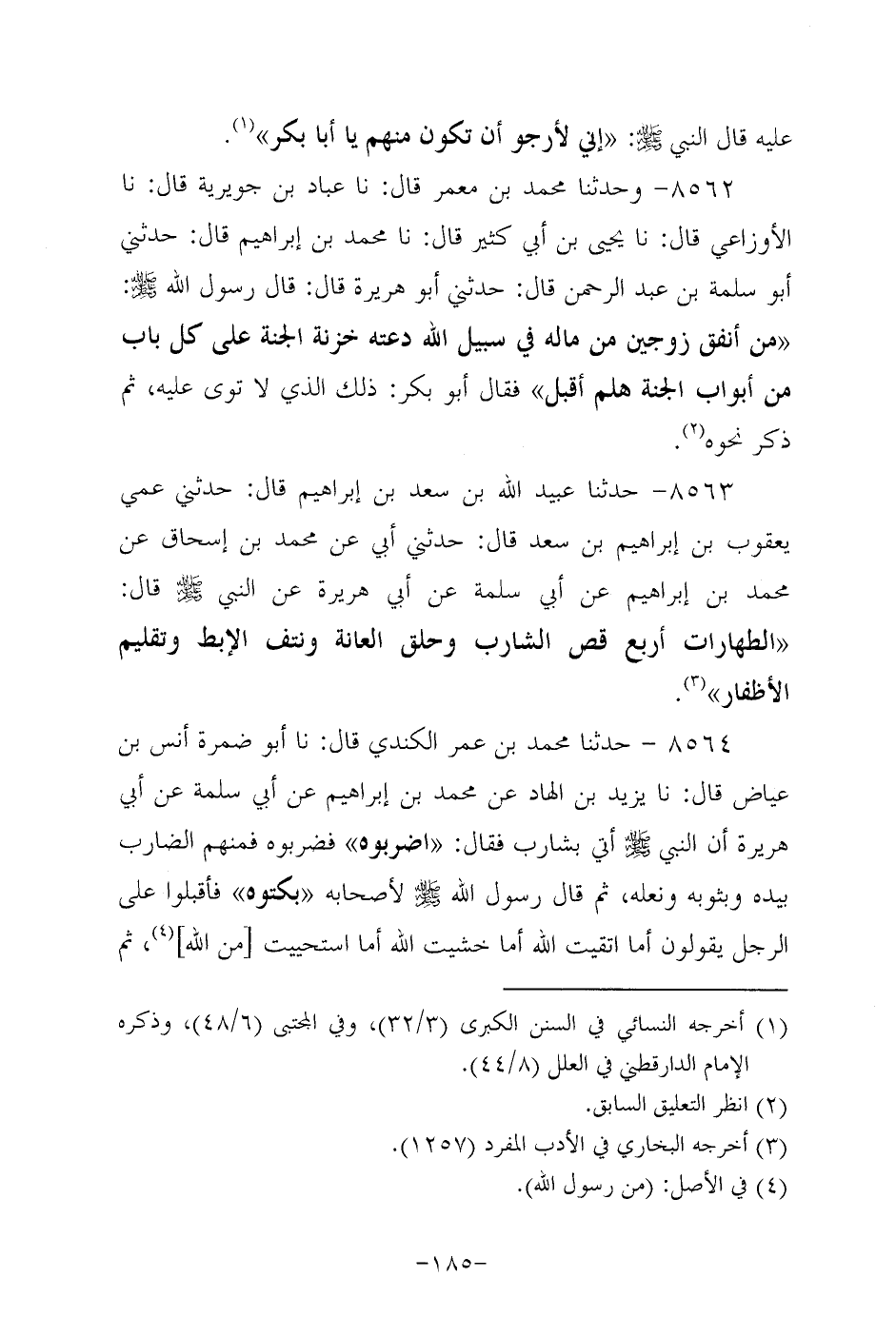 8563- حَدَّثنا عُبَيد اللَّهِ بْنُ سَعْد بْنِ إِبْرَاهِيمَ قَالَ: حَدَّثَنِي عَمِّي يَعْقُوبُ بْنُ إِبْرَاهِيمَ بْنِ سَعْد قال: حدثني أبي عَنْ مُحَمد بْنِ إِسْحَاقَ، عَن مُحَمد بْنِ إبراهيم عن أبي سَلَمَة، عَن أَبِي هُرَيرة، عَن النَّبِيّ صَلَّى اللَّهُ عَلَيه وَسَلَّم قال: الطهارات أربع قص الشارب وحلق العانة ونتف الإبط وتقليم الأظفار.