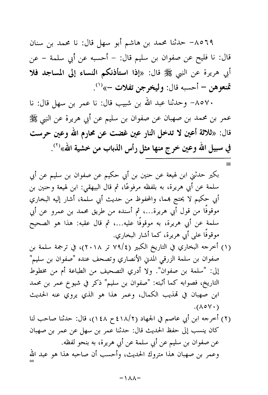 8569- حَدَّثنا مُحَمد بن هاشم أَبُو سَهْل، قَال: حَدَّثنا مُحَمد بن سنان، قَال: حَدَّثنا فليح عن صفوان بن سليم قال: أحسبه، عَن أبي سَلَمَة، عَن أَبِي هُرَيرة، عَن النَّبِيّ صَلَّى اللَّهُ عَلَيه وَسَلَّم قال: إذا استأذنكم النساء إلى المساجد فلا تمنعوهن، أَحسَبُهُ قال: وليخرجن تفلات.