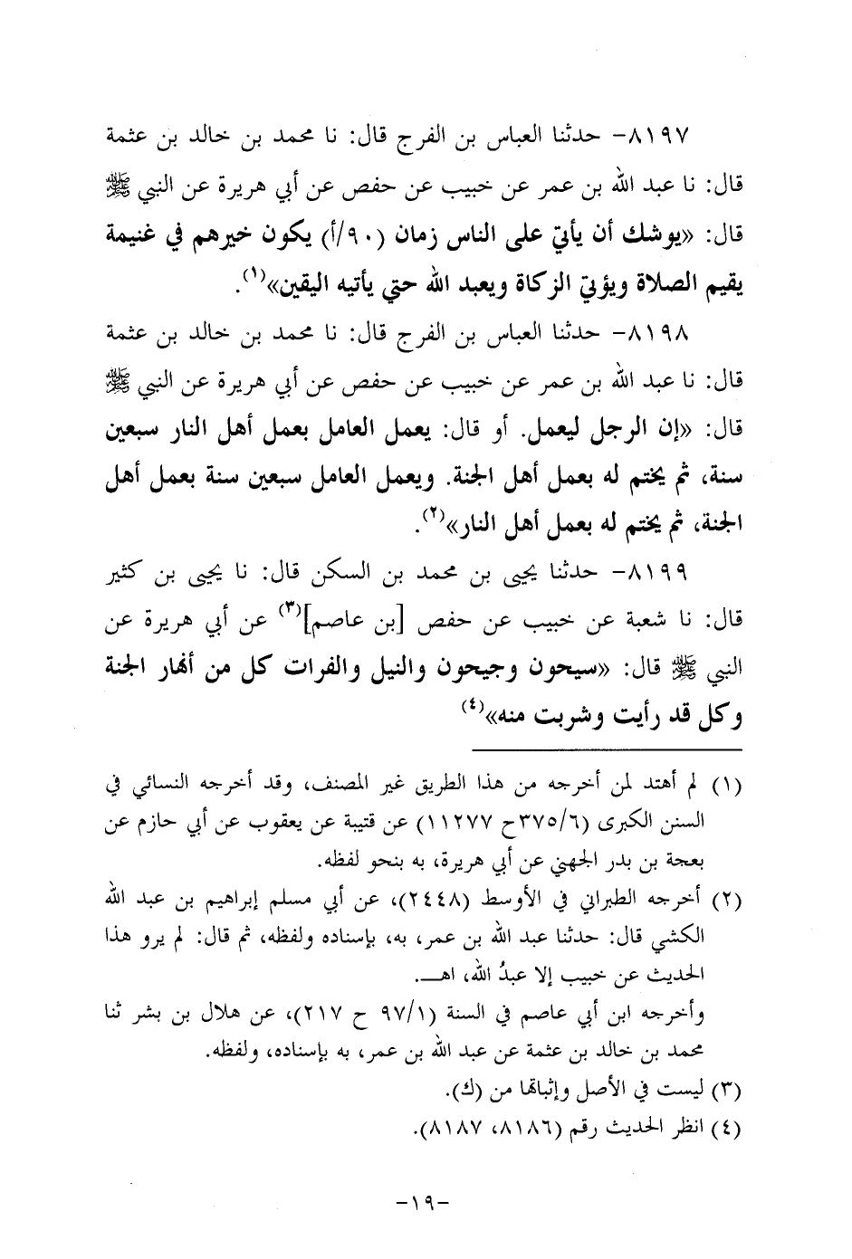 8197- حَدَّثنا العباس بن الفرج، قَال: حَدَّثنا مُحَمد بن خالد بن عثمة، قَال: حَدَّثنا عَبد الله بن عُمَر عَنْ خُبَيْبٍ عَنْ حَفْصٍ، عَن أَبِي هُرَيرة، عَن النَّبِيّ صَلَّى اللَّهُ عَلَيه وَسَلَّم قَالَ: يوشك أن يأتي على الناس زمان يكون خيرهم في غنيمة يقيم الصلاة ويؤتي الزكاة ويعبد الله حتى يأتيه اليقين.