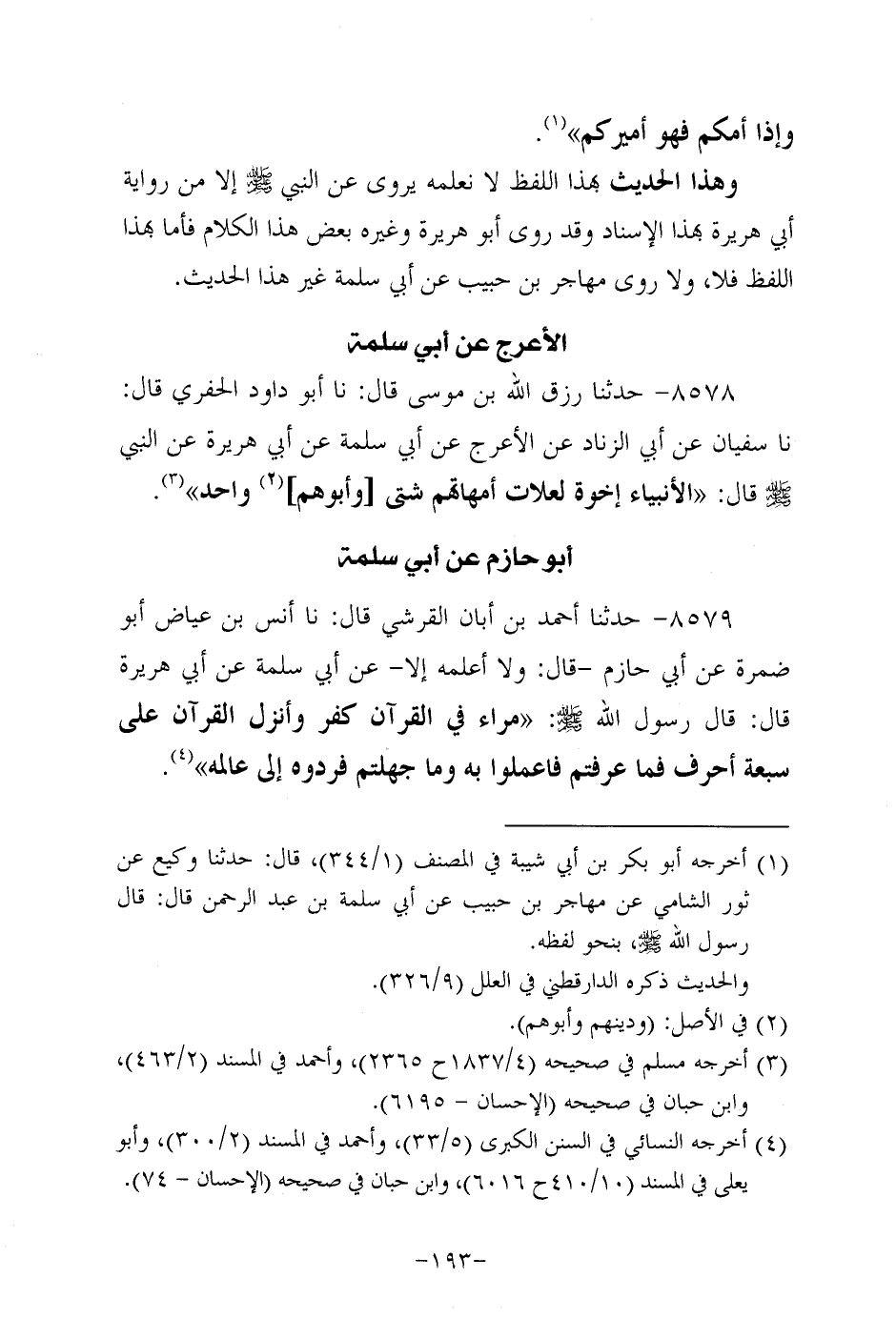 8578- حَدَّثنا رزق الله بن موسى، قَال: حَدَّثنا أَبُو داود الحفري، قَال: حَدَّثَنا سُفْيَانُ، عَن أبي الزِّنَاد، عَن الأَعرَج، عَن أبي سَلَمَة، عَن أَبِي هُرَيرة، عَن النَّبِيّ صَلَّى اللَّهُ عَلَيه وَسَلَّم قال: الأنبياء إخوة لعلات أمهاتهم شتى وأبوهم واحد.