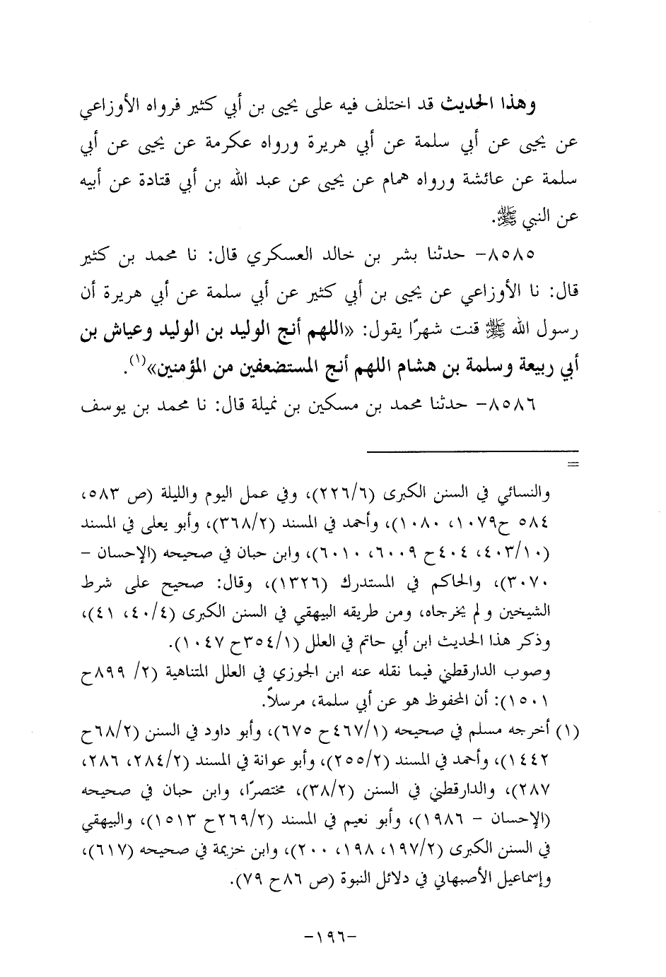 8585- حَدَّثنا بِشْر بن خالد العسكري، قَال: حَدَّثنا مُحَمد بن كثير، قَال: حَدَّثنا الأَوزَاعِيّ، عَن يَحيى بْنِ أَبِي كَثِيرٍ، عَن أَبِي سَلَمَة، عَن أبي هُرَيرة؛ أَنَّ رَسُولَ اللهِ صَلَّى اللَّهُ عَلَيه وَسَلَّم قنت شهرا يقول: اللهم أنج الوليد بن الوليد وعياش بن أبي ربيعة وسلمة بن هشام اللهم أنج المستضعفين من المؤمنين.