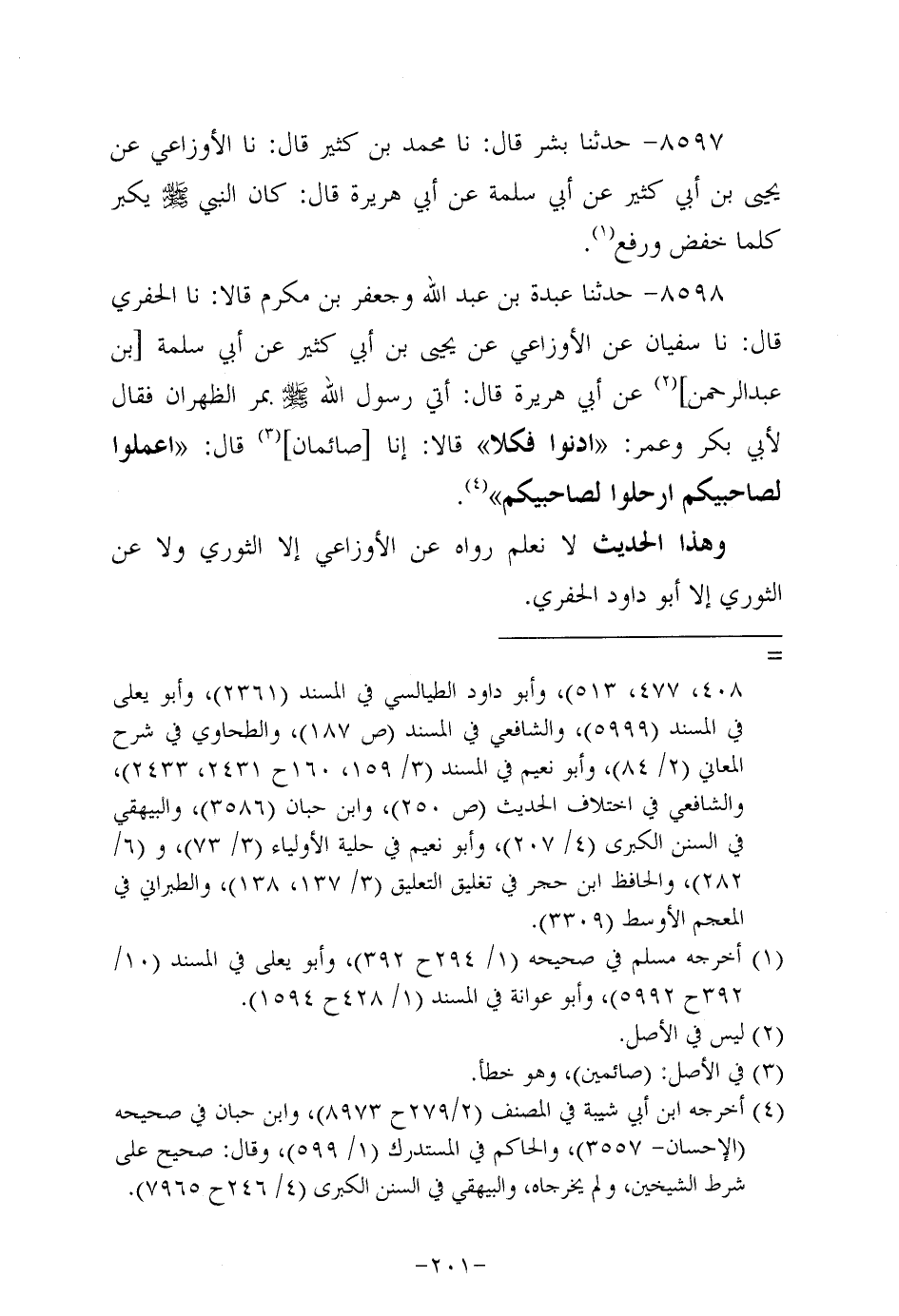 8598- حَدَّثنا عَبدة بن عَبد الله وجعفر بن مكرم، قَالاَ: حَدَّثنَا الحفري، قَال: حَدَّثنا سُفيان، عَن الأَوزَاعِيّ، عَن يَحيى بْنِ أَبِي كَثِيرٍ، عَن أَبِي سَلَمَة بن عَبد الرحمن، عَن أبي هُرَيرة، قَالَ: أَتَى رَسُولَ اللَّهِ صَلَّى اللَّهُ عَلَيه وَسَلَّم بمر الظهران فقال لأبي بكر وعمر: ادنوا فكلا قالا: إنا صائمان قال: اعملوا لصاحبيكم ارحلوا لصاحبيكم.