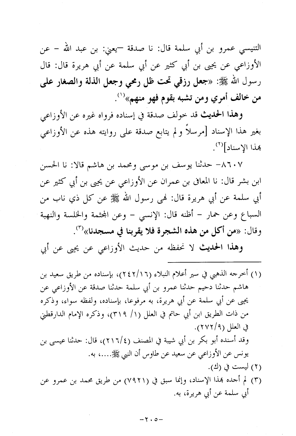 8607- حَدَّثنا يوسف بن موسى، ومُحَمد بن هاشم، قَالاَ: حَدَّثنَا الحسن بن بشر، قَال: حَدَّثنا المعافي بن عمران، عَن الأَوْزاعِيّ، عَن يَحيى بْنِ أَبِي كَثِيرٍ، عَن أَبِي سَلَمَة عن أببي هُرَيرة قَالَ: نَهَى رَسُولُ اللهِ صَلَّى اللَّهُ عَلَيه وَسَلَّم عَنْ كُلِّ ذِي نَابٍ مِنَ السِّبَاعِ، وعَن حمار - أظنه قال: الإنسي - وعَن المجثمة والخلسة والنهبة، وَقال: من أكل من هذه الشجرة فلا يقربنا في مسجدنا.