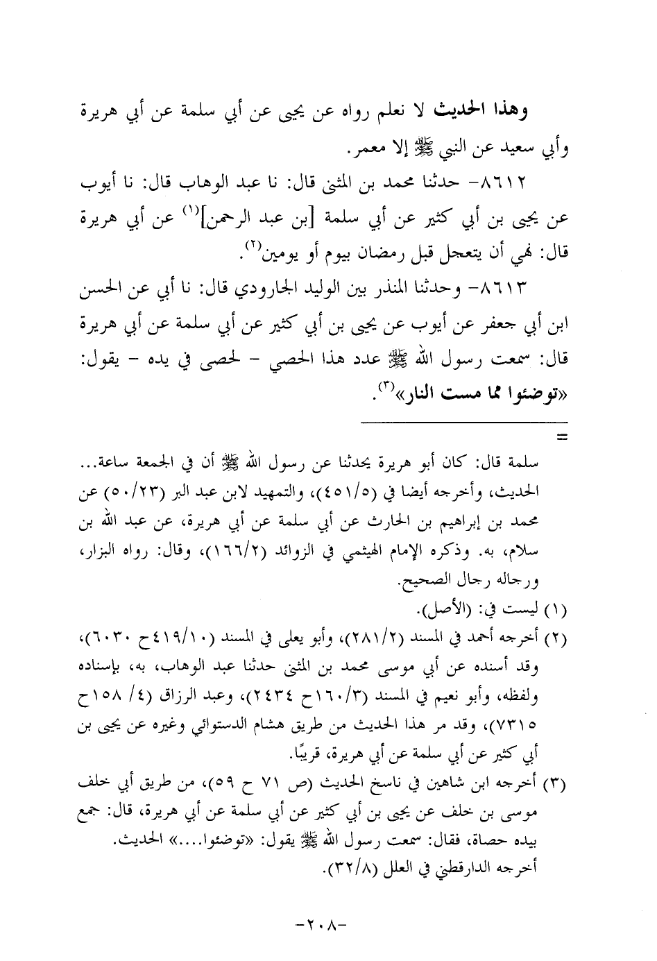 8613- وحَدَّثنا المنذر بن الوليد الجارودي، قَال: حَدَّثنا أَبِي عَنِ الْحَسَنِ بْنِ أَبِي جَعْفَرٍ عَنْ أيوب، عَن يَحيى بن أبي كثر، عَن أبي سَلَمَة، عَن أبي هُرَيرة، قَالَ: سَمِعْتُ رَسُولَ اللَّهِ صَلَّى اللَّهُ عَلَيه وَسَلَّم عدد هذا الحصى - لحصى في يده - يقول: توضؤُوا مما مست النَّارِ.