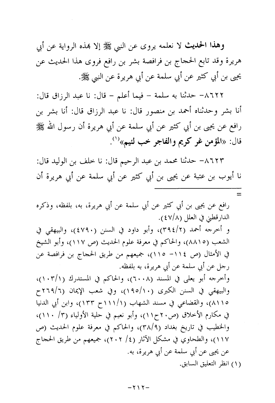8622- حَدَّثنا به سلمة - فيما أعلم - قَال: حَدَّثنا عَبد الرزاق، قال: أَخْبَرَنَا بشر وحَدَّثناه أحمد بن منصور، قَال: حَدَّثنا عَبد الرزاق، قال: أَخْبَرَنَا بِشْر بن رافع، عَن يَحيى بْنِ أَبِي كَثِيرٍ، عَن أَبِي سَلَمَة، عَن أبي هُرَيرة؛ أَنَّ رَسُولَ اللهِ صَلَّى اللَّهُ عَلَيه وَسَلَّم قال: المؤمن غر كريم والفاجر خب لئيم.