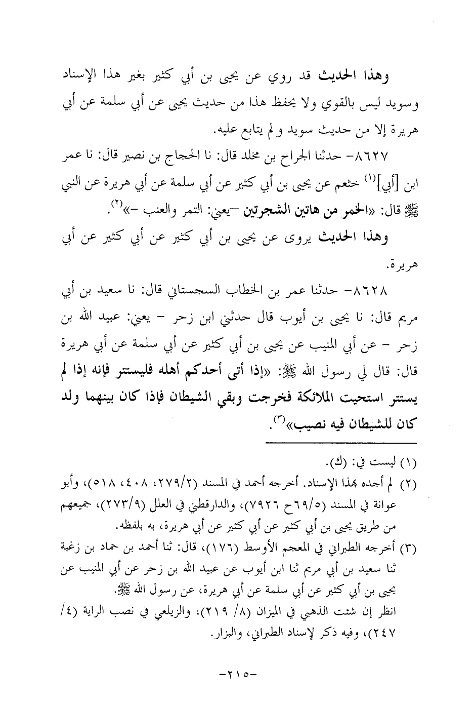 8628- حَدَّثنا عُمَر بن الخطاب السجستاني، قَال: حَدَّثنا سَعِيد بن أبي مريم، قَال: حَدَّثنا يحيى بن أيوب، قَال: حَدَّثني ابن زَحْر، يعني: عُبَيد الله بن زَحْر، عَن أبي المنيب، عَن يَحيى بْنِ أَبِي كَثِيرٍ، عَن أَبِي سَلَمَة، عَن أبي هُرَيرة، قَالَ: قَالَ رَسُول اللهِ صَلَّى اللَّهُ عَلَيه وَسَلَّم: إذا أتى أحدكم أهله فليستتر فإنه إذا لم يستتر استحيت الملائكة فخرجت وبقى الشيطان فإذا كان بينهما ولد كان للشيطان فيه نصيب.