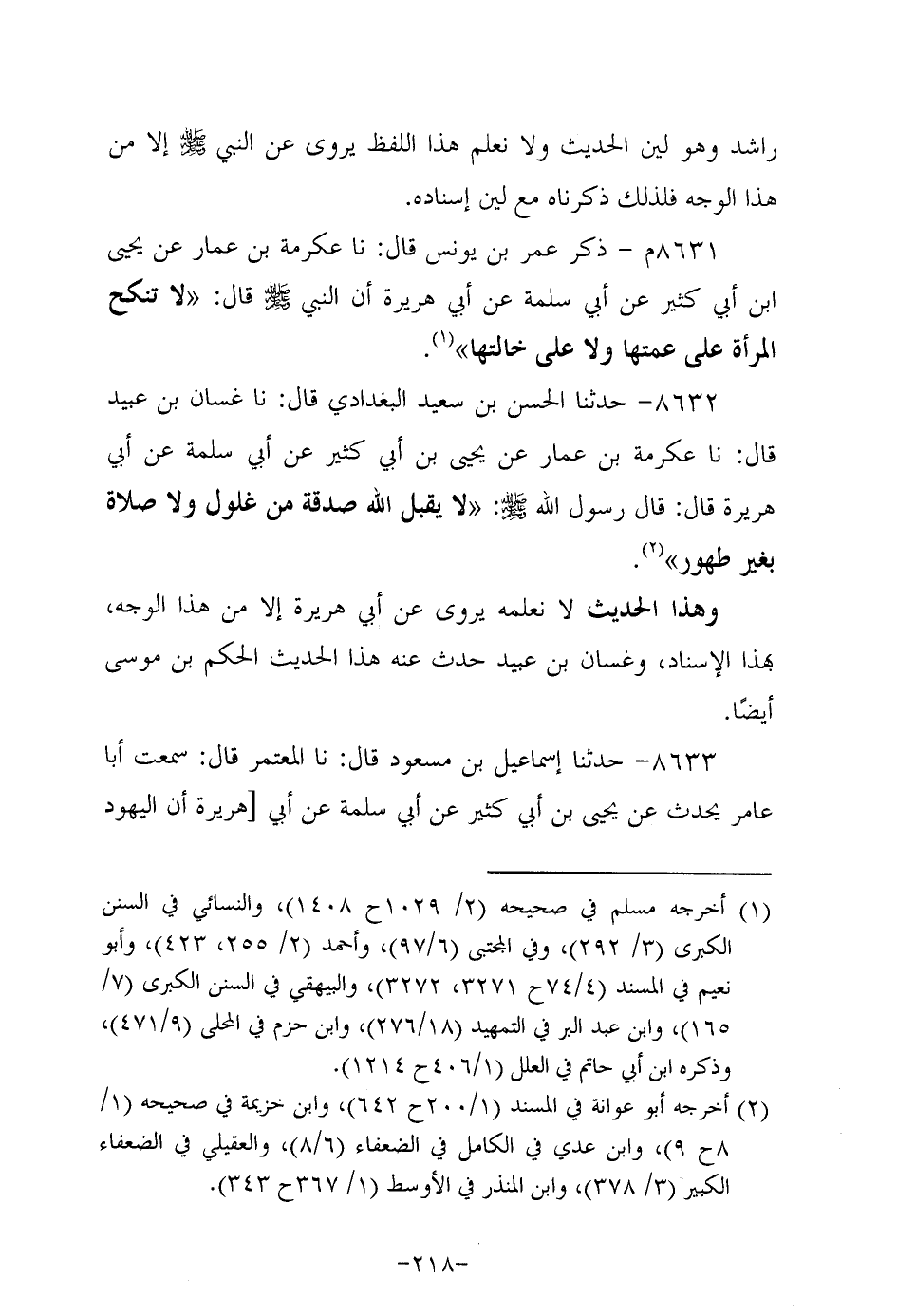 8631م- ذكر عُمَر بن يونس، قَال: حَدَّثنا عكرمة بن عمار، عَن يَحيى بْنِ أَبِي كَثِيرٍ، عَن أَبِي سَلَمَة، عَن أبي هُرَيرة؛ أَنَّ النَّبِيّ صَلَّى اللَّهُ عَلَيه وَسَلَّم، قَال: لاَ تنكح المرأة على عمتها، ولاَ على خالتها.