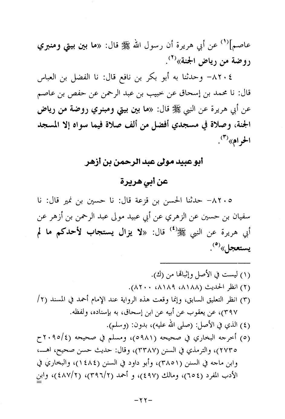 8205- حَدَّثنا الحسن بن قزعة، قَال: حَدَّثنا حسين بن نُمَير، قَال: حَدَّثنا سفيان بن حسين، عَن الزُّهْرِيّ، عَن أبي عُبَيد مولى عَبد الرحمن بن أزهر، عَن أَبِي هُرَيرة، عَن النَّبِيّ صَلَّى اللَّهُ عَلَيه وَسَلَّم، قَال: لاَ يزال يستجاب لأحدكم ما لم يستعجل.