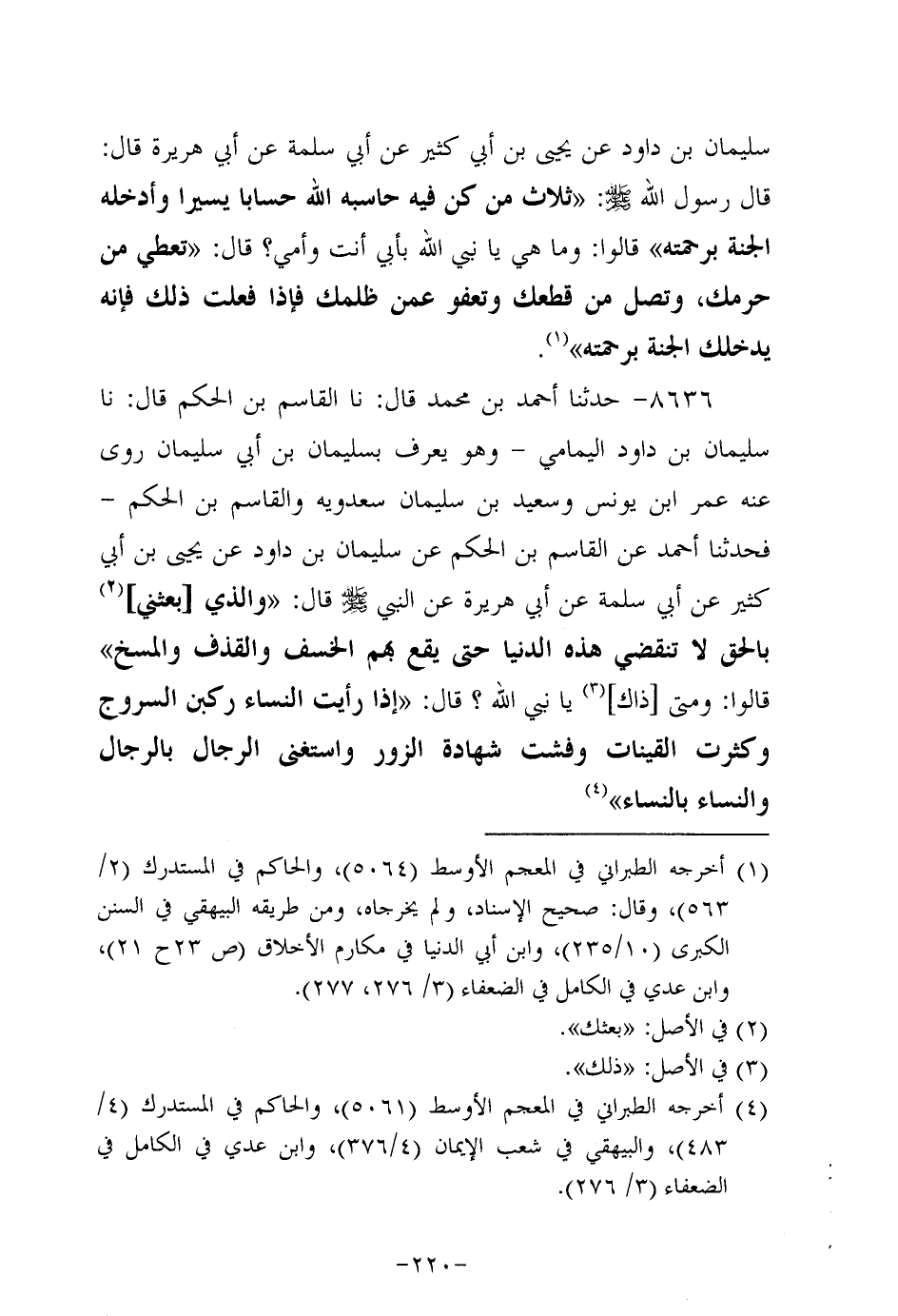 8636- حَدَّثنا أحمد بن مُحَمد، قَال: حَدَّثنا القاسم بن الحكم، قَال: حَدَّثنا سُلَيْمان بن داود اليمامي، وهُو يعرف بسليمان بن أبي سُلَيْمان روى عنه عُمَر بن يونس وسعيد بن سُلَيْمان سعدويه والقاسم بن الحكم فحَدَّثنا أحمد عن القاسم بن الحكم، عَن سُليمان بن داود، عَن يَحيى بْنِ أَبِي كَثِيرٍ، عَن أَبِي سَلَمَة، عَن أَبِي هُرَيرة، عَن النَّبِيّ صَلَّى اللَّهُ عَلَيه وَسَلَّم قال: والذي بعثني بالحق لا تنقضي هذه الدنيا حتى يقع بهم الخسف والقذف والمسخ , قالوا: ومتى ذاك يانبي الله؟ قال: إذا رأيت النساء ركبن السروج وكثرت القينات وفشت شهادة الزور واستغنى الرجال بالرجال والنساء بالنساء.