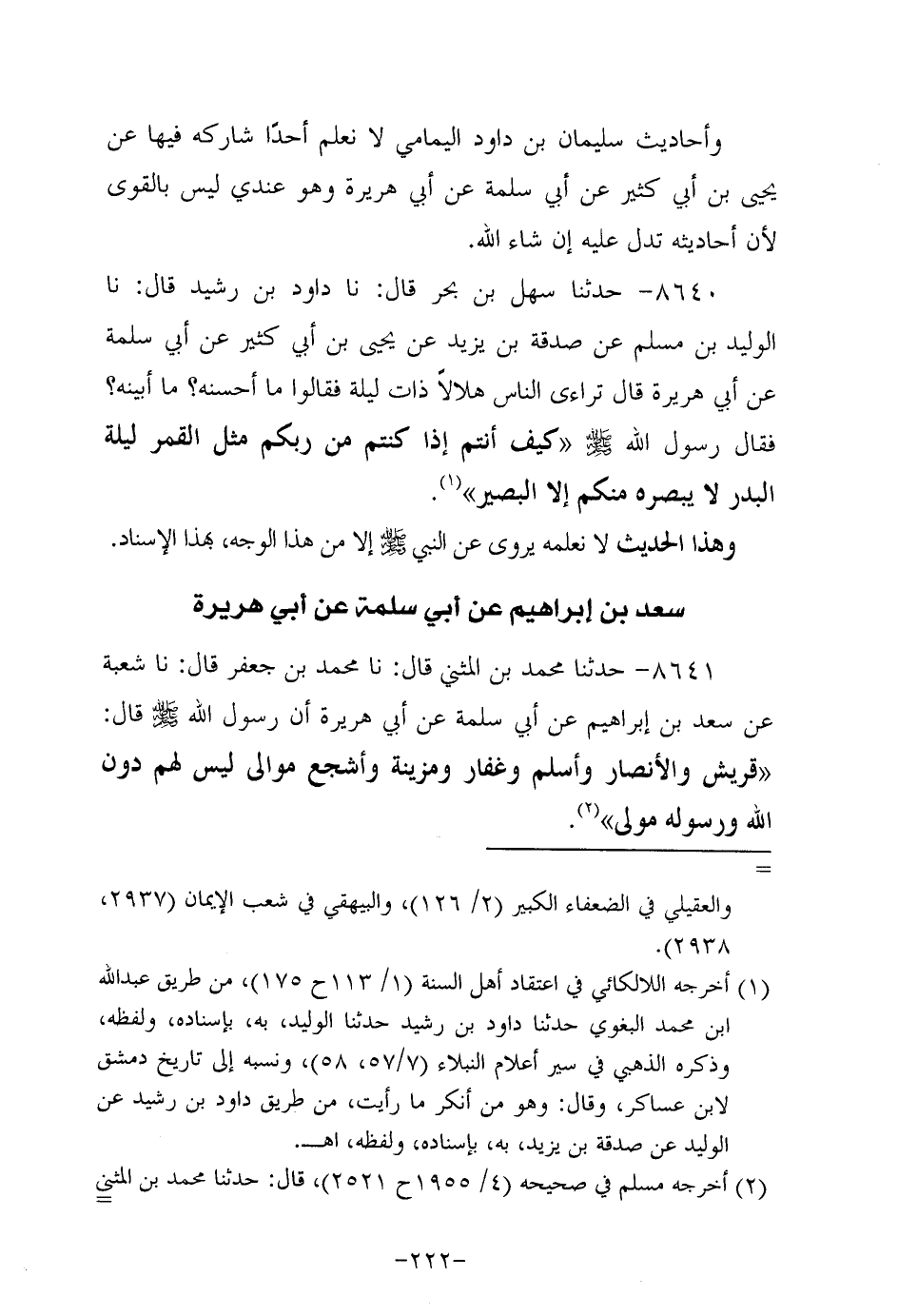 8640- حَدَّثنا سَهْل بن بحر، قَال: حَدَّثنا داود بن رشيد، قَال: حَدَّثنا الوليد بن مسلم، عن صدقة بْنُ يَزِيدَ، عَن يَحيى بْنِ أَبِي كَثِيرٍ، عَن أبي سَلَمَة، عَن أبي هُرَيرة، قال تراءى الناس هلالا ذات ليلة فقالوا ما أحسنه؟ ما أبينه؟ فَقَالَ رَسُولُ اللَّهِ صَلَّى اللَّهُ عَلَيه وَسَلَّم: كيف أنتم إذا كنتم من ربكم مثل القمر ليلة البدر لا يبصره منكم إلاَّ البصير.