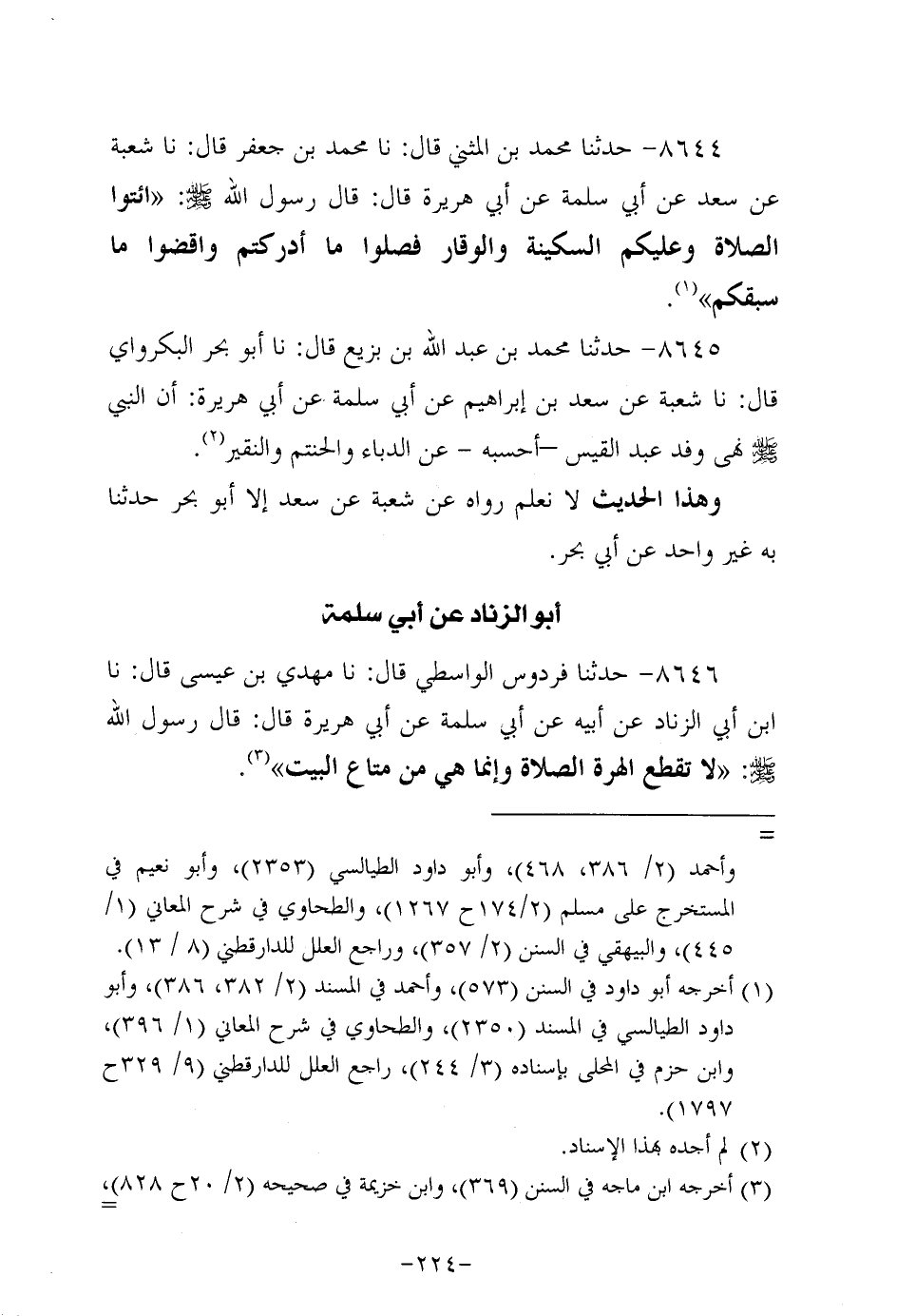 8646- حَدَّثنا فردوس الواسطي، قَال: حَدَّثنا مهدي بن عيسى، قَال: حَدَّثنا ابن أبي الزناد، عَن أَبِيه، عَن أبي سَلَمَة، عَن أبي هُرَيرة، قَالَ: قَالَ رَسُول اللهِ صَلَّى اللَّهُ عَلَيه وَسَلَّم: لا تقطع الهرة الصلاة، وَإنَّما هي من متاع البيت.