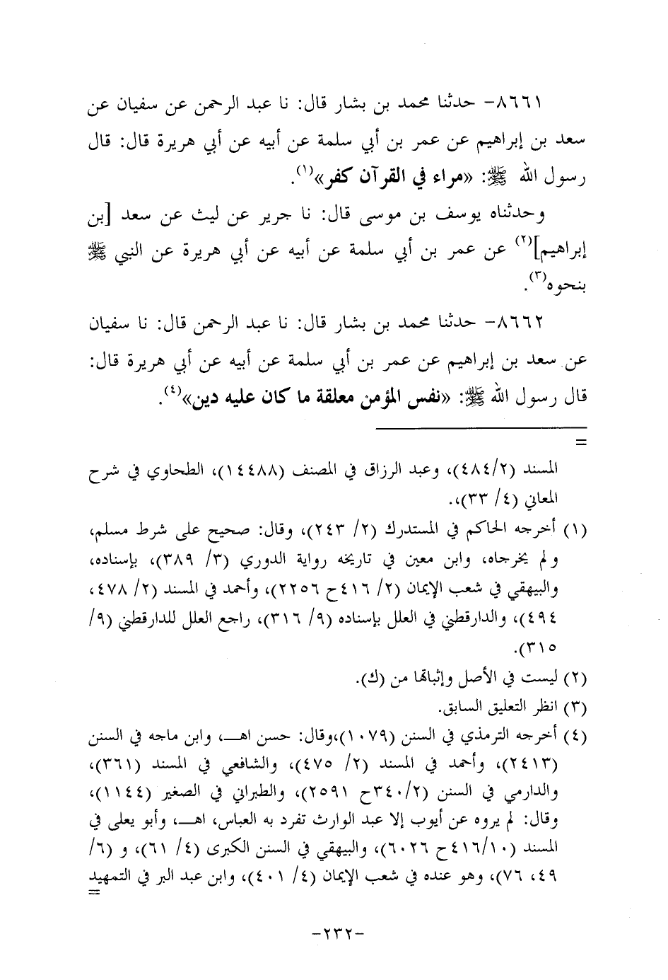 8661- حَدَّثنا مُحَمد بن بَشَّار، قَال: حَدَّثنا عَبد الرَّحمَن، عَن سُفيان، عَن سَعْد بن إبراهيم عن عُمَر بن أبي سَلَمَة، عَن أَبِيه، عَن أبي هُرَيرة، قَالَ: قَالَ رَسُول اللهِ صَلَّى اللَّهُ عَلَيه وَسَلَّم: مراء في القرآن كفر.