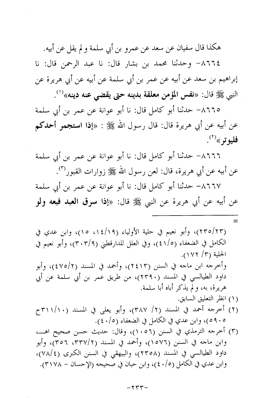 8664- وحَدَّثنا مُحَمد بن بَشَّار، قَال: حَدَّثنا عَبد الرحمن، قَال: حَدَّثنا إبراهيم بن سَعْد، عَن أَبِيه عن عُمَر بن أبي سَلَمَة، عَن أَبِيه، عَن أَبِي هُرَيرة، عَن النَّبِيّ صَلَّى الله عَلَيه وَسَلَّم قال: نفس المؤمن معلقة بدينه حتى يقضي عنه دينه.