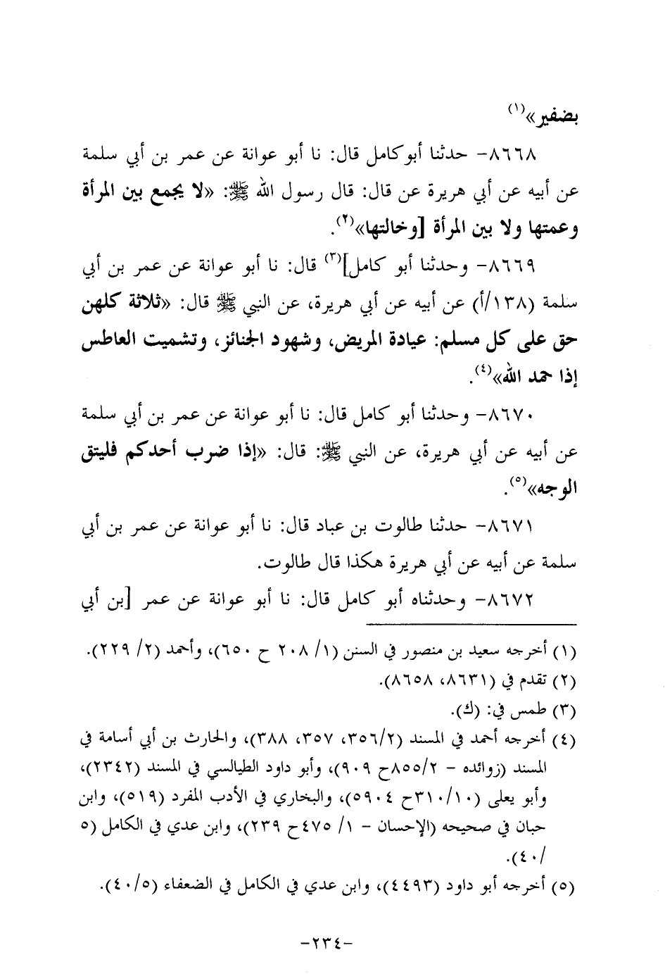 8668- حَدَّثنا أَبُو كامل، قَال: حَدَّثنا أَبُو عَوَانة، عَن عُمَر بن أبي سَلَمَة، عَن أَبِيه، عَن أبي هُرَيرة، قَالَ: قَالَ رَسُول اللهِ صَلَّى اللَّهُ عَلَيه وَسَلَّم: لا يجمع بين المرأة وعمتها، ولاَ بين المرأة وخالتها.