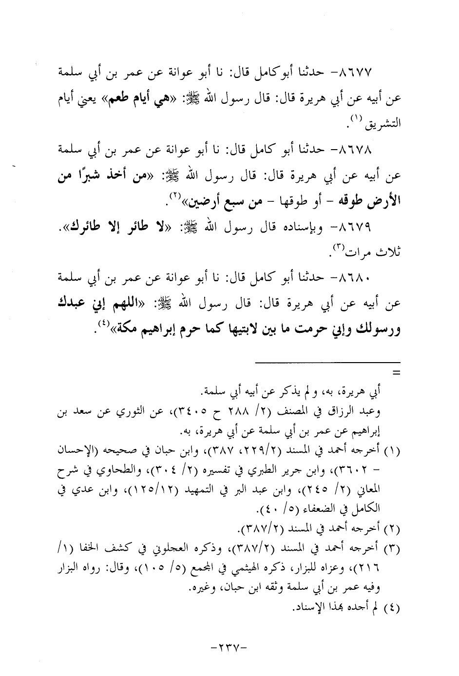 8677- حَدَّثنا أَبُو كامل، قَال: حَدَّثنا أَبُو عَوَانة، عَن عُمَر عن عُمَر بن أبي سَلَمَة، عَن أَبِيه، عَن أبي هُرَيرة، قَالَ: قَالَ رَسُول اللهِ صَلَّى اللَّهُ عَلَيه وَسَلَّم: هي أيام طعم، يعني ايام التشريق.