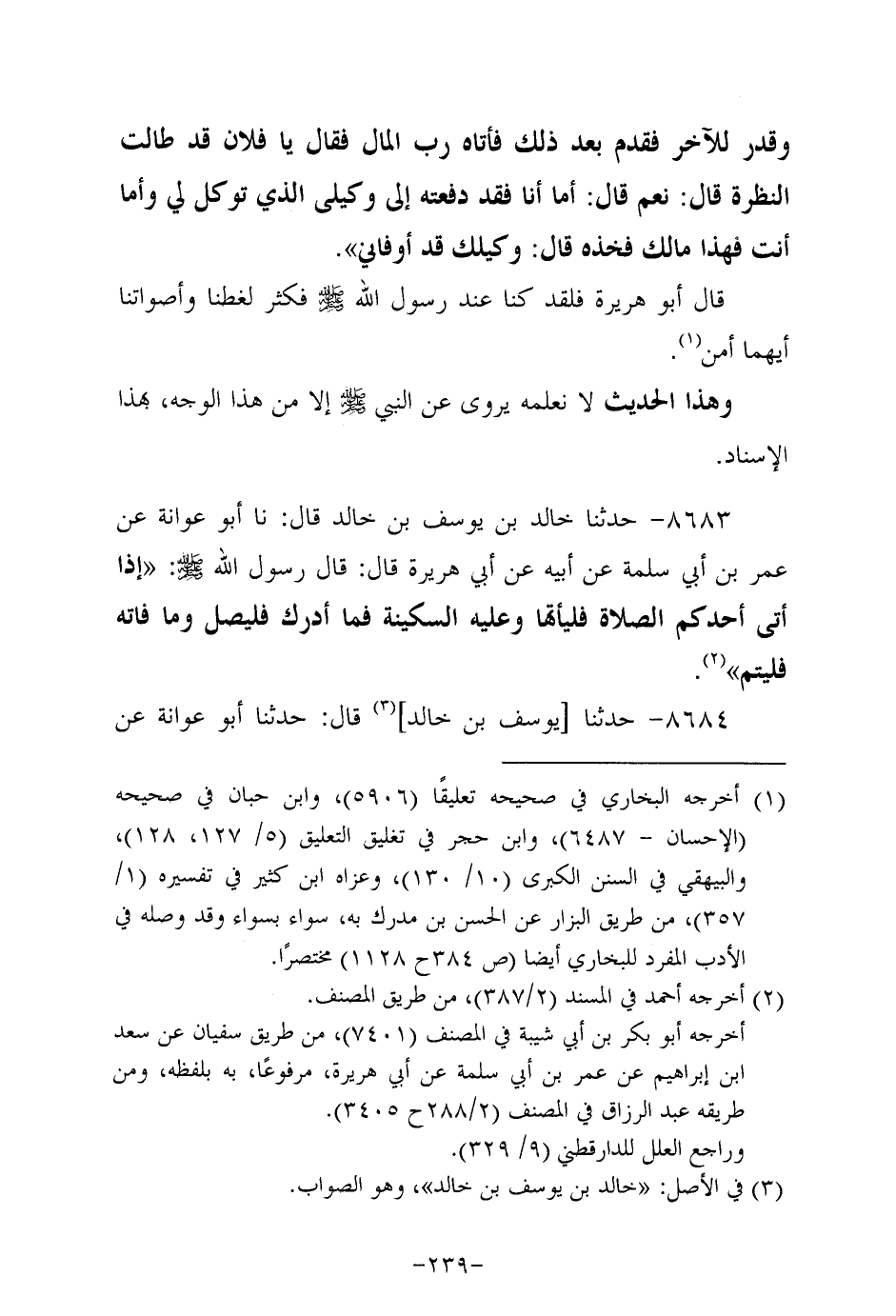 8683- حَدَّثنا خَالِدُ بْنُ يُوسُفَ بْنِ خَالِدٍ، قَال: حَدَّثنا أَبُو عَوَانة، عَن عُمَر بن أبي سَلَمَة، عَن أَبِيه، عَن أبي هُرَيرة، قَالَ: قَالَ رَسُول اللهِ صَلَّى اللَّهُ عَلَيه وَسَلَّم: إذا أتى أحدكم الصلاة فليأتها وعليه السكينة فما أدرك فليصل وما فاته فليتم.
