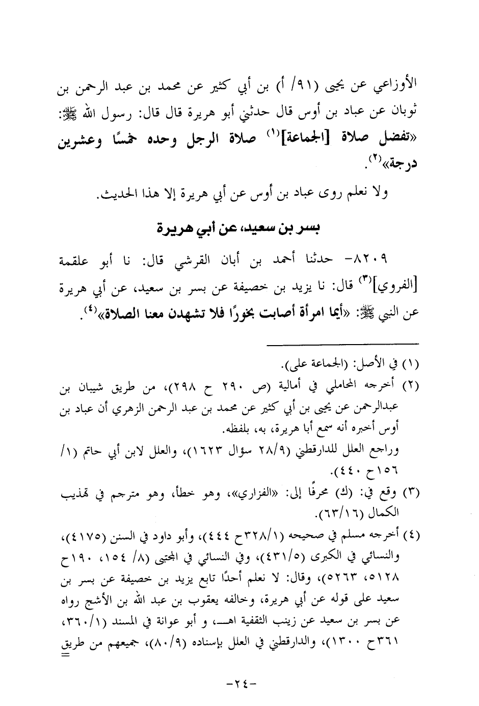 8209- حَدَّثنا أحمد بن أَبَان القرشي، قَال: حَدَّثنا أَبُو علقمة الفروي، قَال: حَدَّثنا يزيد بن خُصَيفة عن بُسْر بن سَعِيد، عَن أَبِي هُرَيرة، عَن النَّبِيّ صَلَّى اللَّهُ عَلَيه وَسَلَّم: أيما امرأة أصابت بخورا , فلا تشهدن معنا الصلاة.