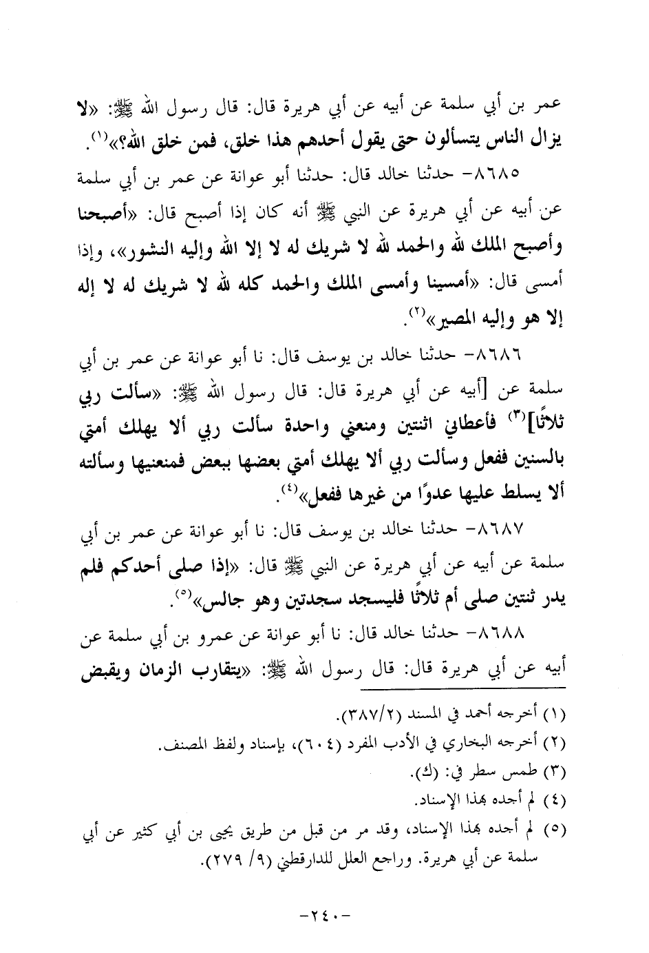 8688- حَدَّثنا خالد، قَال: حَدَّثنا أَبُو عَوَانة، عَن عَمْرو بن أبي سَلَمَة، عَن أَبِيه، عَن أبي هُرَيرة، قَالَ: قَالَ رَسُول اللهِ صَلَّى اللَّهُ عَلَيه وَسَلَّم: يتقارب الزمان ويقبض العلم وتظهر الفتن ويكثر الهرج قالوا يا رَسولَ اللهِ وما الهرج قال: القتل.