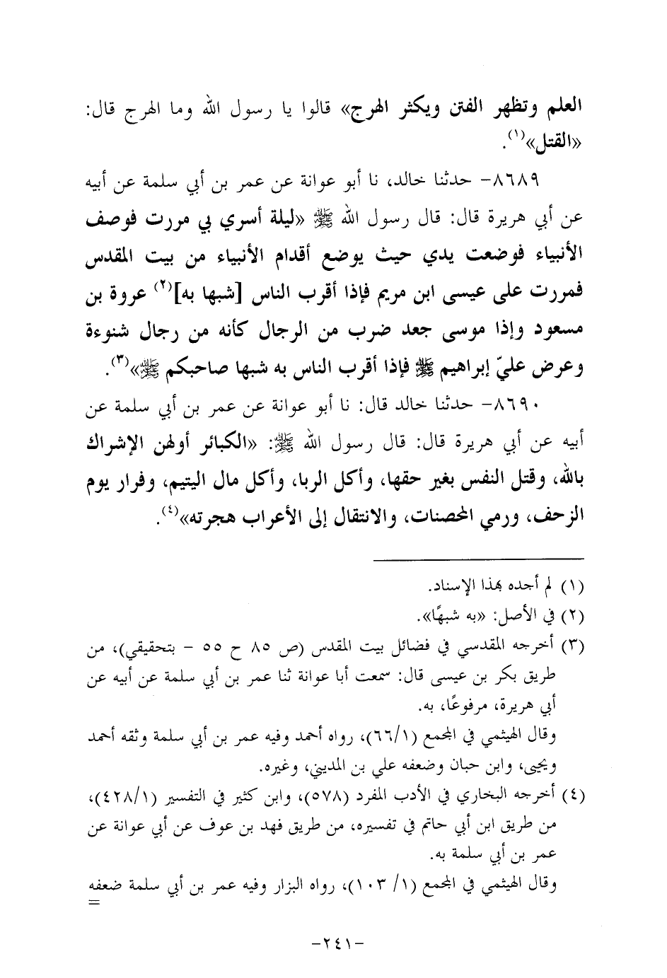 8690- حَدَّثنا خالد، قَال: حَدَّثنا أَبُو عَوَانة، عَن عُمَر بن أبي سَلَمَة، عَن أَبِيه، عَن أبي هُرَيرة، قَالَ: قَالَ رَسُول اللهِ صَلَّى اللَّهُ عَلَيه وَسَلَّم: الكبائر أولهن الإشراك بالله وقتل النفس بغير حقها وأكل الربا وأكل مال اليتيم وفرار يوم الزحف ورمي المحصنات والانتقال إلى الأعراب [بعد] (1) هجرته.