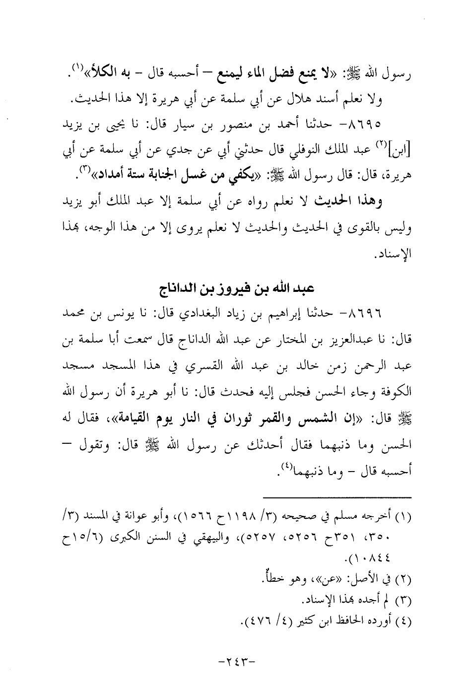 8696- حَدَّثنا إبراهيم بن زياد البغدادي، قَال: حَدَّثنا يونس بن مُحَمد، قَال: حَدَّثنا عَبد العزيز بن المختار عن عَبد الله الداناج، قَال: سَمعتُ أبا سلمة بن عَبد الرحمن زمن خالد بن عَبد الله القسري في هذا المسجد مسجد الكوفة وجاء الحسن فجلس إليه فحدث، قَال: حَدَّثنا أَبُو هُرَيرة أَنَّ رَسُولَ اللهِ صَلَّى اللَّهُ عَلَيه وَسَلَّم قال: إن الشمس والقمر ثوران في النار يوم القيامة فقال له الحسن وما ذنبهما؟ فقال أحدثك عَنْ رَسُولِ اللَّهِ صَلَّى اللَّهُ عَلَيه وَسَلَّم وتقول، أحسبه قال: وما ذنبهما.