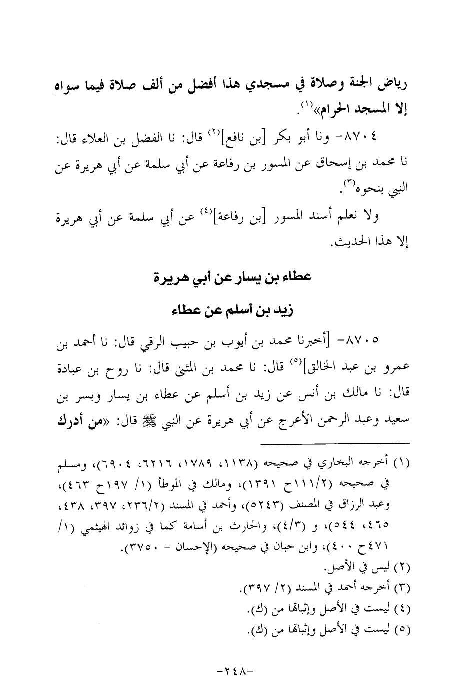 8706- حَدَّثنا أحمد بن أَبَان القرشي، قَال: حَدَّثنا عَبد الْعَزِيزِ بْنُ مُحَمد، عَن زَيْدِ بْنِ أسلم عن بسر بن سَعِيد وعبد الرحمن الأَعرَج وعطاء بن يسار، عَن أَبِي هُرَيرة، عَن النَّبِيّ صَلَّى اللَّهُ عَلَيه وَسَلَّم نحوه.