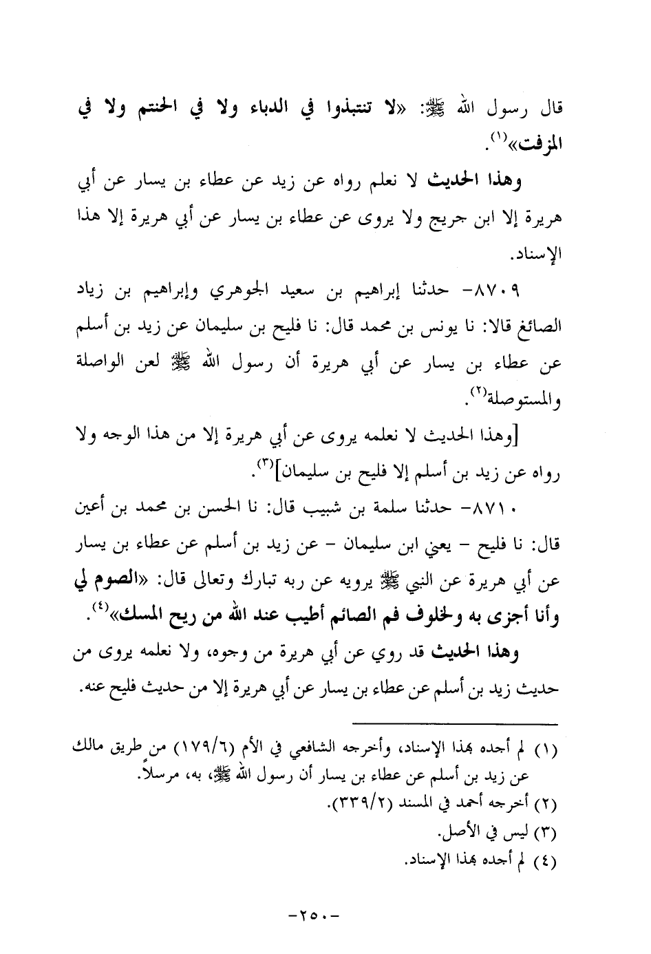 8710- حَدَّثنا سلمة بن شَبِيب، قَال: حَدَّثنا الحسن بن مُحَمد بن أعين، قَال: حَدَّثنا فليح، يعني ابن سُلَيْمان، عَن زَيد بْنِ أَسْلَمَ، عَن عَطاء بْنِ يسار، عَن أَبِي هُرَيرة، عَن النَّبِيّ صَلَّى اللَّهُ عَلَيه وَسَلَّم يرويه عن ربه تبارك وتعالى قال: الصوم لي، وَأنا أجزي به ولخلوف فم الصائم أطيب عند الله من ريح المسك.