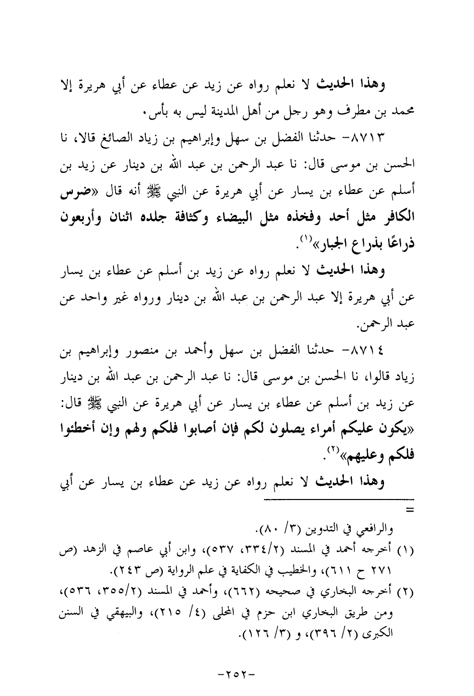 8713- حَدَّثنا الْفَضْلُ بْنُ سَهْل وَإِبْرَاهِيمُ بْنُ زِيَادٍ الصائغ قالا حَدَّثنا الحسن بن موسى، قَال: حَدَّثنا عَبد الرَّحْمَنِ بْنُ عَبد اللَّهِ بْنِ دِينَارٍ، عَن زَيد بْنِ أَسْلَمَ، عَن عَطاء بْنِ يسار، عَن أَبِي هُرَيرة، عَن النَّبِيّ صَلَّى اللَّهُ عَلَيه وَسَلَّم؛ أَنَّه قال: ضرس الكافر مثل أحد وفخذه مثل البيضاء وكثافة جلده اثنان وأربعون ذِرَاعًا بِذِرَاعِ الْجَبَّارِ.