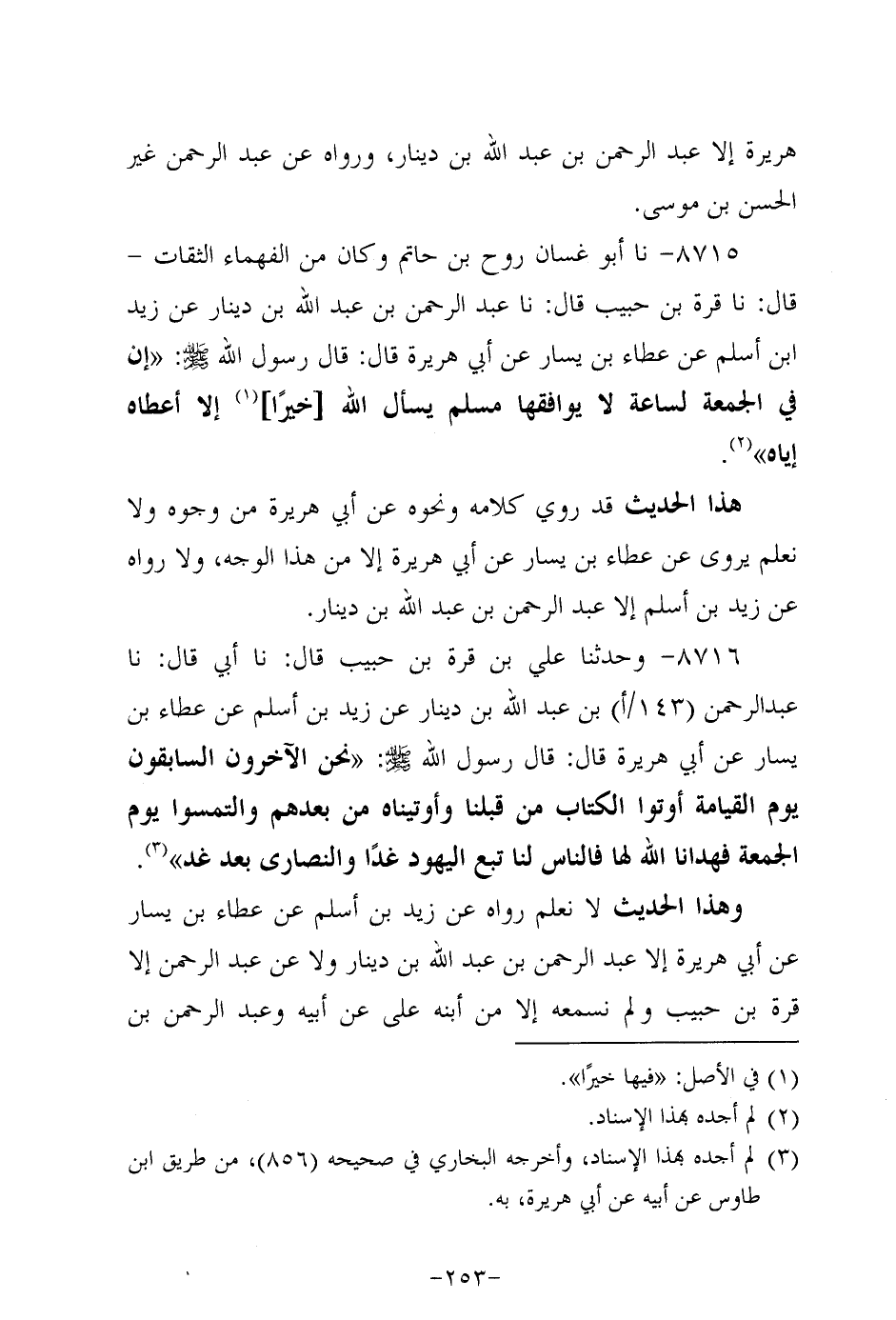 8715- حَدَّثنا أَبُو غسان روح بن حاتم، وَكان من الفهماء الثقات، قَال: حَدَّثنا قرة بن حبيب، قَال: حَدَّثنا عَبد الرَّحْمَنِ بْنُ عَبد اللَّهِ بْنِ دِينَارٍ، عَن زَيد بْنِ أَسْلَمَ، عَن عَطاء بْنِ يسار، عَن أبي هُرَيرة، قَالَ: قَالَ رَسُول اللهِ صَلَّى اللَّهُ عَلَيه وَسَلَّم: إن في الجمعة لساعة لا يوافقها مسلم يسأل الله خيرا إلاَّ أعطاه إياه.