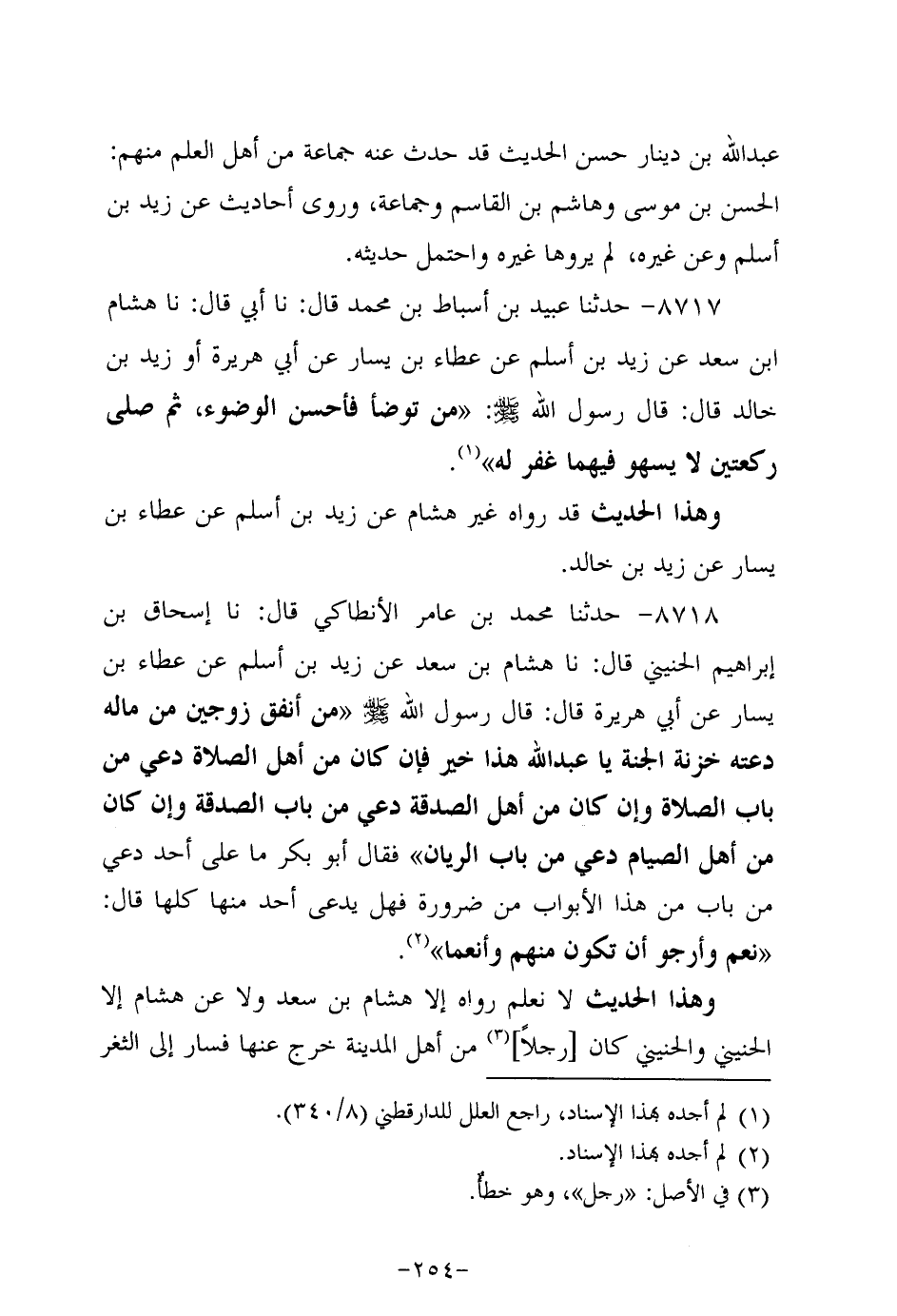 8717- حَدَّثنا عُبَيد بن أسباط بن مُحَمد، قَال: حَدَّثنا أبي، قَال: حَدَّثنا هِشَامُ بْنُ سَعْد، عَن زَيد بْنِ أَسْلَمَ، عَن عَطاء بن يسار، عَن أبي هُرَيرة، أو زيد بن خَالِدٌ قَالَ: قَالَ رَسُول اللهِ صَلَّى اللَّهُ عَلَيه وَسَلَّم: من توضأ فأحسن الوضوء، ثُمَّ صلى ركعتين لا يسهو فيهما غفر له.