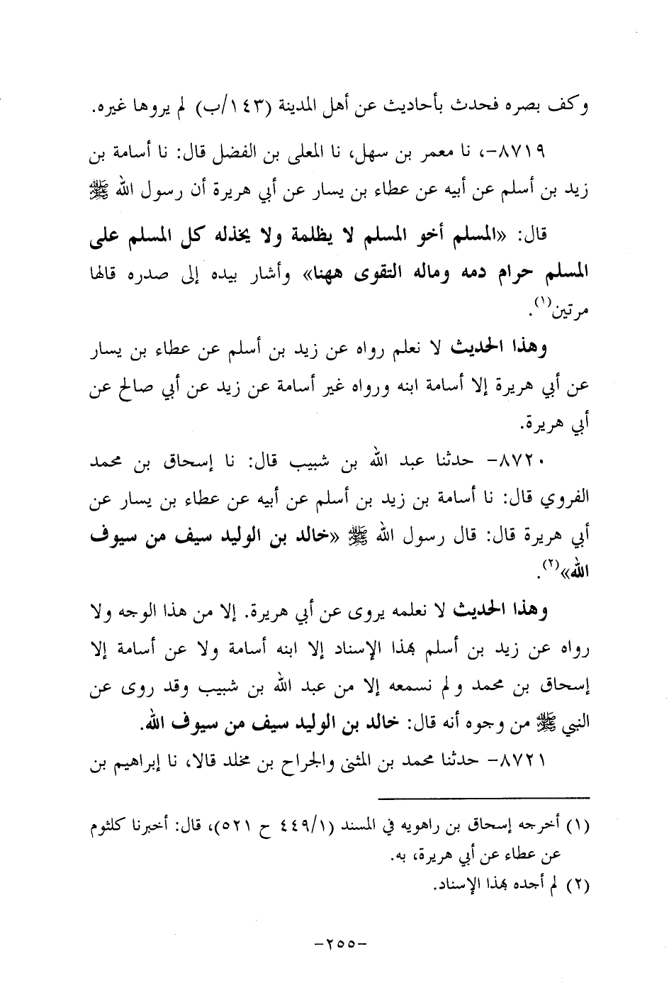 8720- حَدَّثنا عَبد الله بن شَبِيب، قَال: حَدَّثنا إسحاق بن مُحَمد الفروي، قَال: حَدَّثنا أسامة بْنُ زَيْدِ بْنِ أَسْلَمَ، عَن أَبِيه، عَن عَطاء بن يسار، عَن أبي هُرَيرة، قَالَ: قَالَ رَسُول اللهِ صَلَّى اللَّهُ عَلَيه وَسَلَّم: خالد بن الوليد سيف من سيوف اللَّهُ.