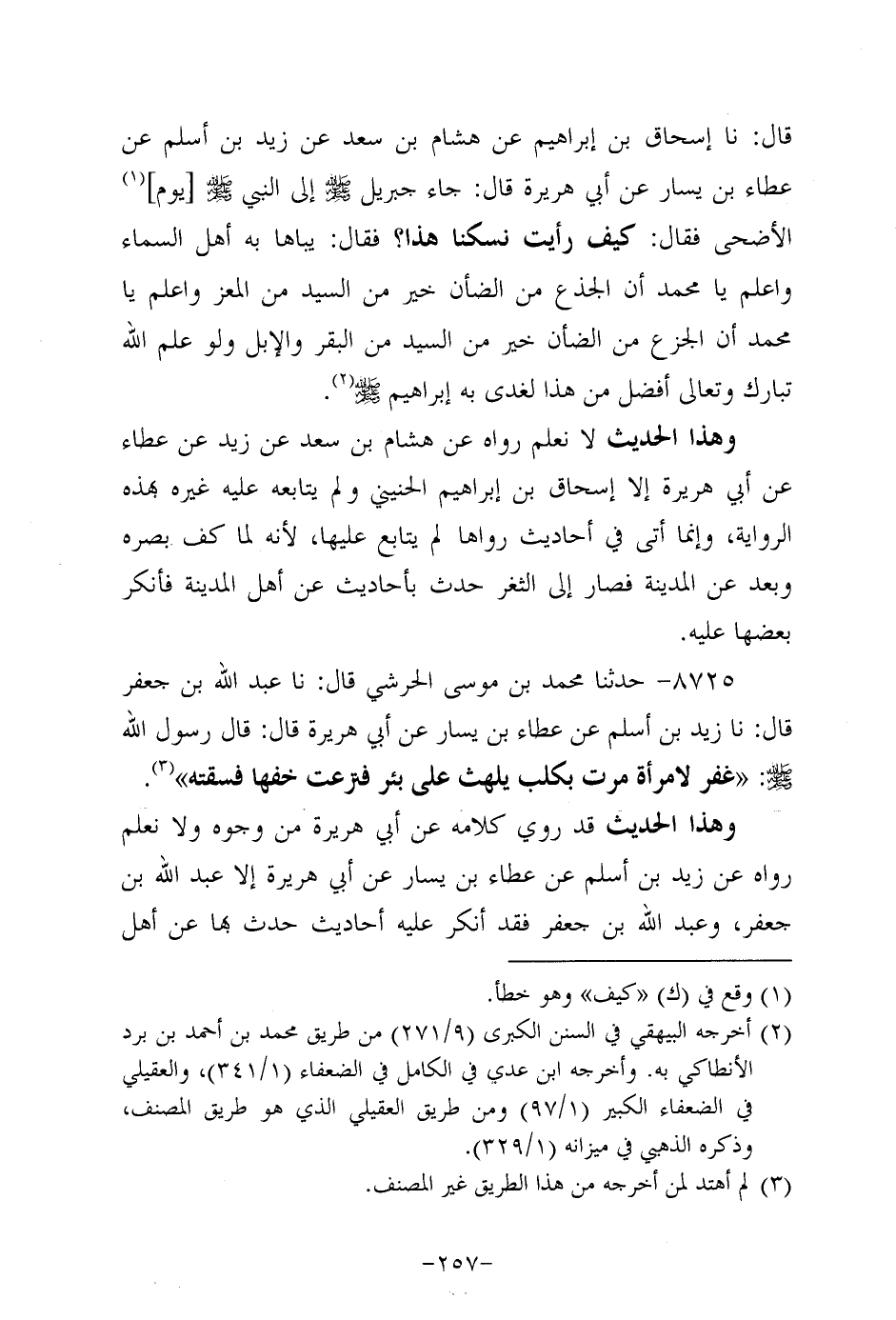 8725- حَدَّثنا مُحَمد بن موسى الحرشي، قَال: حَدَّثنا عَبد الله بن جعفر، قَال: حَدَّثنا زَيْدِ بْنِ أَسْلَمَ، عَن عَطاء بْنِ يَسَارٍ، عَن أبي هُرَيرة، قَالَ: قَالَ رَسُول اللهِ صَلَّى اللَّهُ عَلَيه وَسَلَّم: غفر لامرأة مرت بكلب يلهث على بئر فنزعت خفها فسقته.