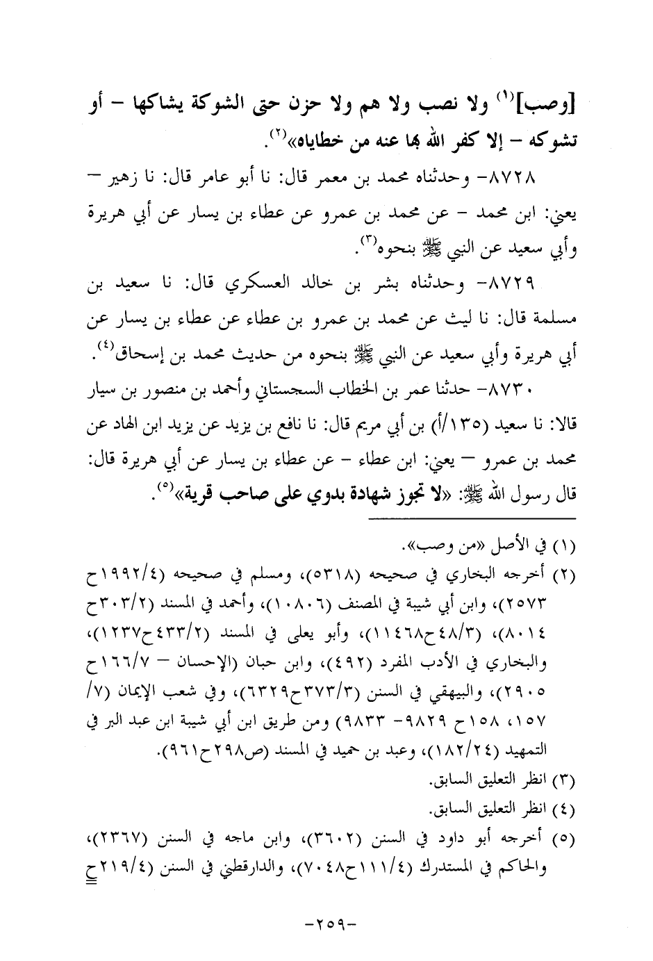 8730- حَدَّثنا عُمَر بن الخطاب السجستاني، وَأحمد بن منصور بن سيار، قَالاَ: حَدَّثنَا سَعِيد بن أبي مريم، قَال: حَدَّثنا نافع بن يزيد عن يزيد بن الهاد عن مُحَمد بن عَمْرو، يعني ابن عطاء، عَن عَطاء بن يسار، عَن أبي هُرَيرة، قَالَ: قَالَ رَسُول اللهِ صَلَّى اللَّهُ عَلَيه وَسَلَّم: لا تجوز شهادة بدوي على صاحب قرية.