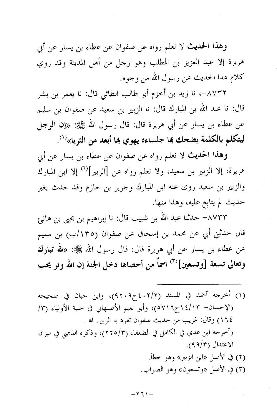 8732- حَدَّثنا زَيْدُ بْنُ أَخْزَمَ أَبُو طَالِبٍ الطَّائِيُّ، قَال: حَدَّثنا يعمر بن بشر، قَال: حَدَّثنا عَبد الله بن المبارك، قَال: حَدَّثنا الزبير بن سَعِيد، عَن صفوان بن سليم، عَن عَطاء بن يسار، عَن أبي هُرَيرة، قَالَ: قَالَ رَسُول اللهِ صَلَّى اللَّهُ عَلَيه وَسَلَّم: إن الرجل ليتكلم بالكلمة يضحك بها جلساءه يهوي بها أبعد من الثريا.
