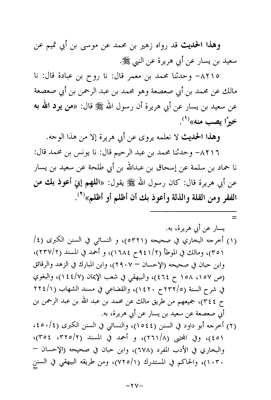 8216- وحَدَّثنا مُحَمد بن عَبد الرحيم، قَال: حَدَّثنا يونس بن مُحَمد، قال، حَدَّثنا حماد بن سلمة عَنْ إِسْحَاقَ بْنِ عَبد اللَّهِ بْنِ أَبِي طلحة، عَن سَعِيد بن يسار، عَن أبي هُرَيرة، قَالَ: كَانَ رَسُولُ اللَّهِ صَلَّى اللَّهُ عَلَيه وَسَلَّم يَقُولُ: اللَّهُمَّ إِنِّي أَعُوذُ بِكَ مِنَ الفقر، وَمَنْ القلة والذلة وأعوذ بك أن أظلم، أو أظلم.