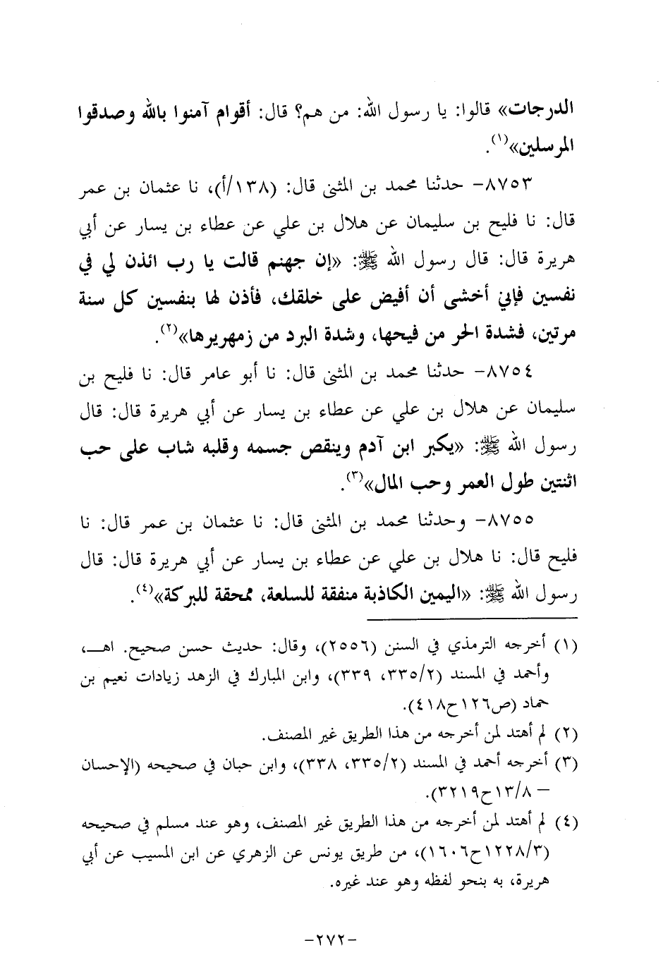 8753- حَدَّثَنا مُحَمَّدُ بْنُ الْمُثَنَّى، قَال: حَدَّثنا عثمان بن عُمَر، قَال: حَدَّثنا فُلَيْحُ بْنُ سُلَيْمان عَنْ هِلالِ بْنِ عَلِيٍّ، عَن عَطاء بن يسار، عَن أبي هُرَيرة؛ قَالَ قَالَ رَسُولُ اللَّهِ صَلَّى اللَّهُ عَلَيه وَسَلَّم: إن جهنم قالت يا رب ائذن لي في نفسين فإني أخشى أَن أفيض على خلقك فأذن لها بنفسين كل سنة مَرَّتَيْنِ فشدة الحر من فيحها وشدة البرد من زمهريرها.
