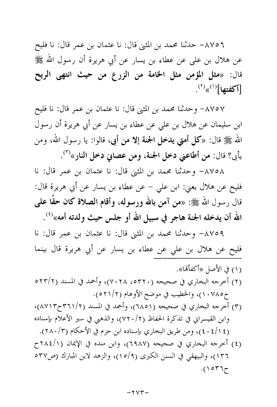8756- حَدَّثَنا مُحَمَّدُ بْنُ الْمُثَنَّى، قَال: حَدَّثنا عثمان بن عُمَر، قَال: حَدَّثنا فليح عن هلال بن علي، عَن عَطاء بن يسار، عَن أبي هُرَيرة؛ أَنَّ رَسُولَ اللهِ صَلَّى اللَّهُ عَلَيه وَسَلَّم قال: مثل المؤمن مثل الخامة من الزرع من حيث انتهى الريح أكفتها.