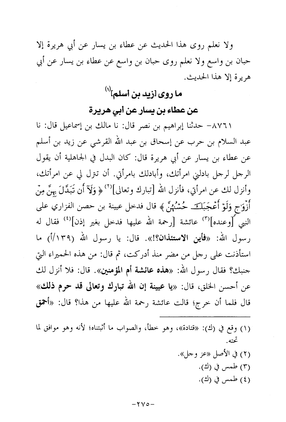 8761- حَدَّثنا إبراهيم بن نصر، قَال: حَدَّثنا مالك بن إسماعيل، قَال: حَدَّثنا عَبْدُ السَّلاَمِ بْنُ حَرْبٍ , عَنْ إِسْحَاقَ بْنِ عَبْدِ اللهِ بْنِ الْقُرَشِيِّ , عَنْ زَيْدِ بْنِ أَسْلَمَ , عَنْ عَطَاءِ بْنِ يَسَارٍ , عَنْ أَبِي هُرَيْرَةَ , قَالَ: كَانَ الْبَدَلُ فِي الْجَاهِلِيَّةِ أَنْ يَقُولَ الرَّجُلُ لِلرَّجُلِ بادلني امرأتك وأبادلك بامرأتي، أن تَنْزِل عَنِ امْرَأَتِكَ وَأَنْزَلُ لَكَ عَنِ امْرَأَتِي، فَأَنْزَلَ اللَّهُ تَبَارَكَ تَعَالَى: {وَلاَ أَنْ تُبَدَّلَ بِهِنَّ مِنْ أَزْوَاجٍ وَلَوْ أَعْجَبَكَ حُسْنُهُنَّ} .