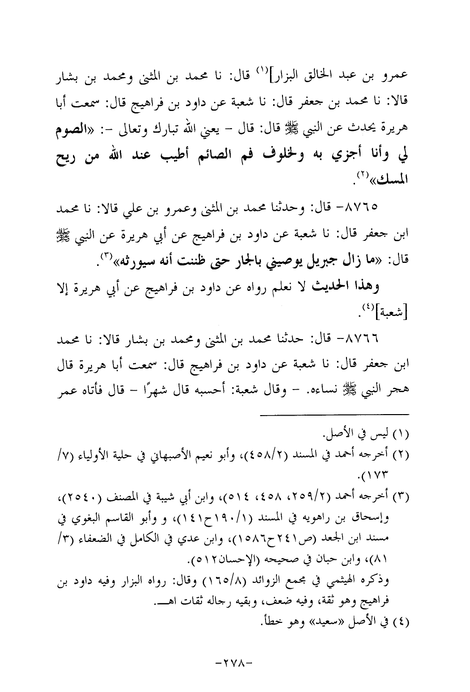 8766- قَال: حَدَّثَنا مُحَمَّدُ بْنُ الْمُثَنَّى وَمُحَمَّدُ بْنُ بَشَّارٍ، قَالاَ: حَدَّثنَا مُحَمَّدُ بْنَ جَعْفَرٍ، قَال: حَدَّثنا شُعْبَةُ، عَن داود بن فراهيج، قال: سَمِعْتُ أبا هُرَيرة قال هجر النَّبِيّ صَلَّى الله عَلَيه وَسَلَّم نساءه، وَقال شعبة: أحسبه قال شهرا قال: فأتاه عُمَر بن الخطاب، وهُو على حصير قد أثر الحصير بجنبه فقال يا رَسولَ اللهِ كسرى، قال أحسبه، وقيصر يشربون في الذهب والفضة وأنت هكذا فقال النَّبِيّ صَلَّى الله عَلَيه وَسَلَّم: إنهم عجلت لهم طيباتهم في حياتهم الدنيا، وَقال النَّبِيّ صَلَّى الله عَلَيه وَسَلَّم: الشهر تسع وعشرون هكذا وهكذا وهكذا، وكسر الإبهام في الثالثة.