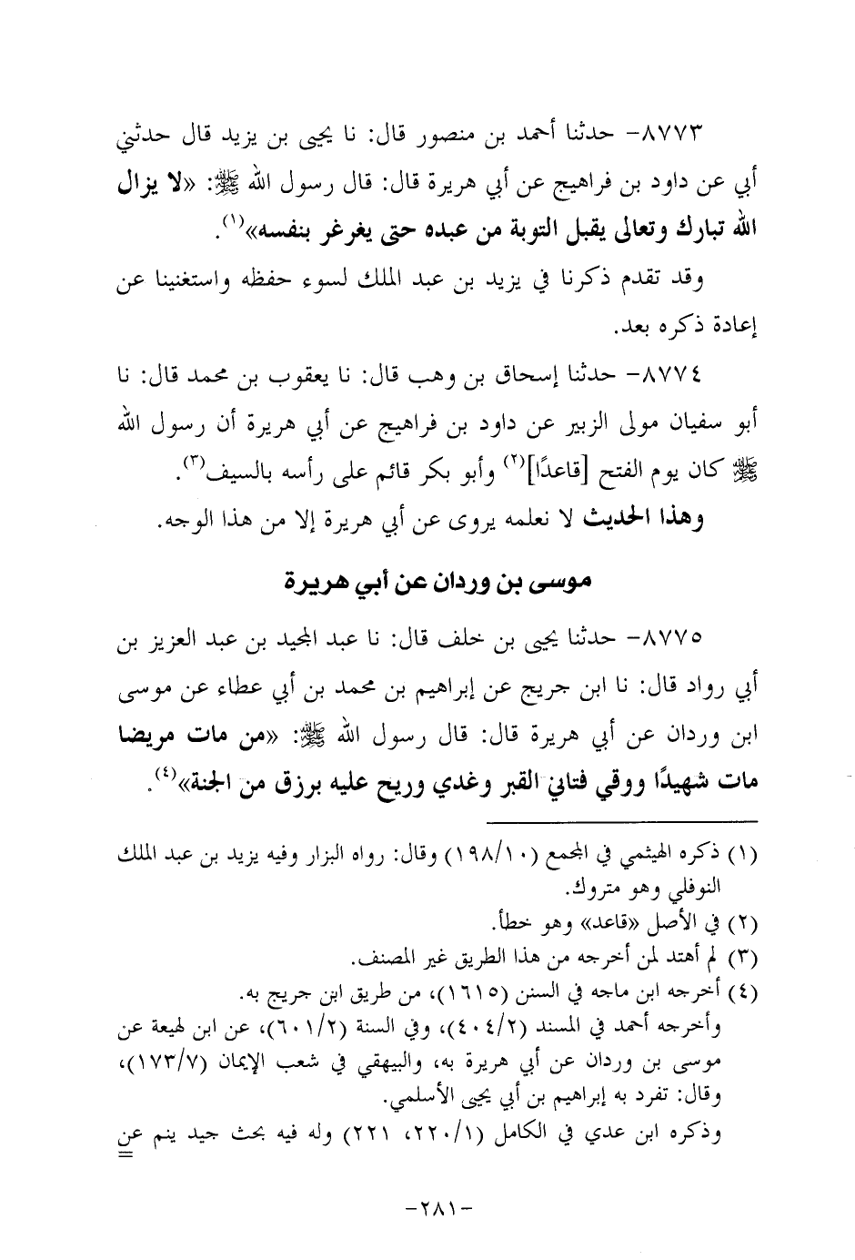 8773- حَدَّثنا أحمد بن منصور، قَال: حَدَّثنا يحيى بن يزيد قال: حدثني أبي، عَن دَاود بن فراهيج، عَن أبي هُرَيرة، قَالَ: قَالَ رَسُول اللهِ صَلَّى اللَّهُ عَلَيه وَسَلَّم: لا يزال الله تبارك وتعالى يقبل التوبة عن عَبده حتى يغرغر بنفسه.