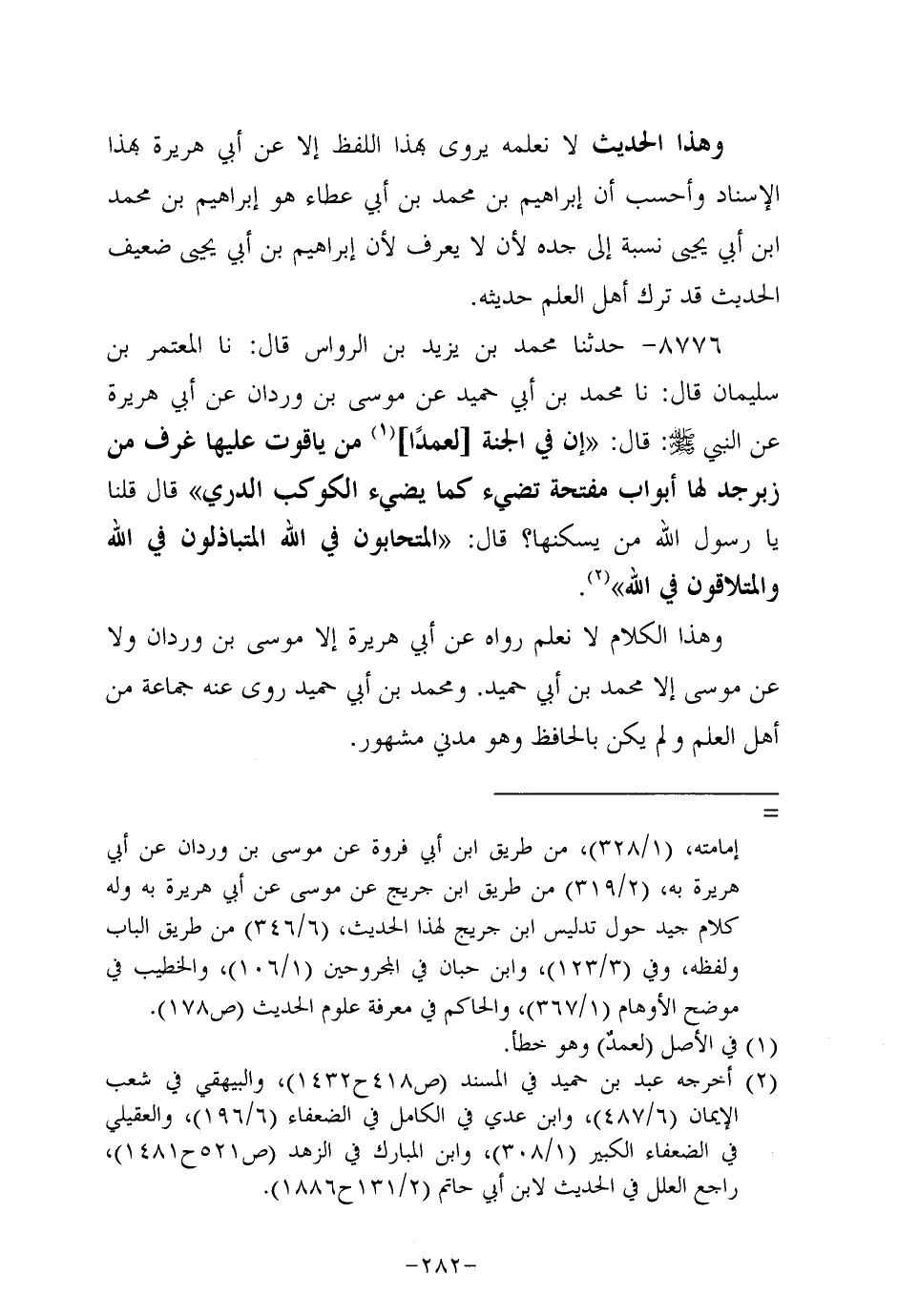 8776- حَدَّثنا مُحَمد بن يزيد ابن الرواس، قَال: حَدَّثنا المعتمر بن سُلَيْمان، قَال: حَدَّثنا مُحَمد بْنُ أَبِي حُمَيد عَنْ مُوسَى بْنِ وردان، عَن أَبِي هُرَيرة، عَن النَّبِيّ صَلَّى اللَّهُ عَلَيه وَسَلَّم قال: إن في الجنة لعمدا من ياقوت عليها غرف من زبرجد لها أبواب مفتحة تضيء كما يضيء الكوكب الدري قال قلنا يا رَسولَ اللهِ من يسكنها؟ قال: المتحابون في الله المتباذلون في الله والمتلاقون في الله.