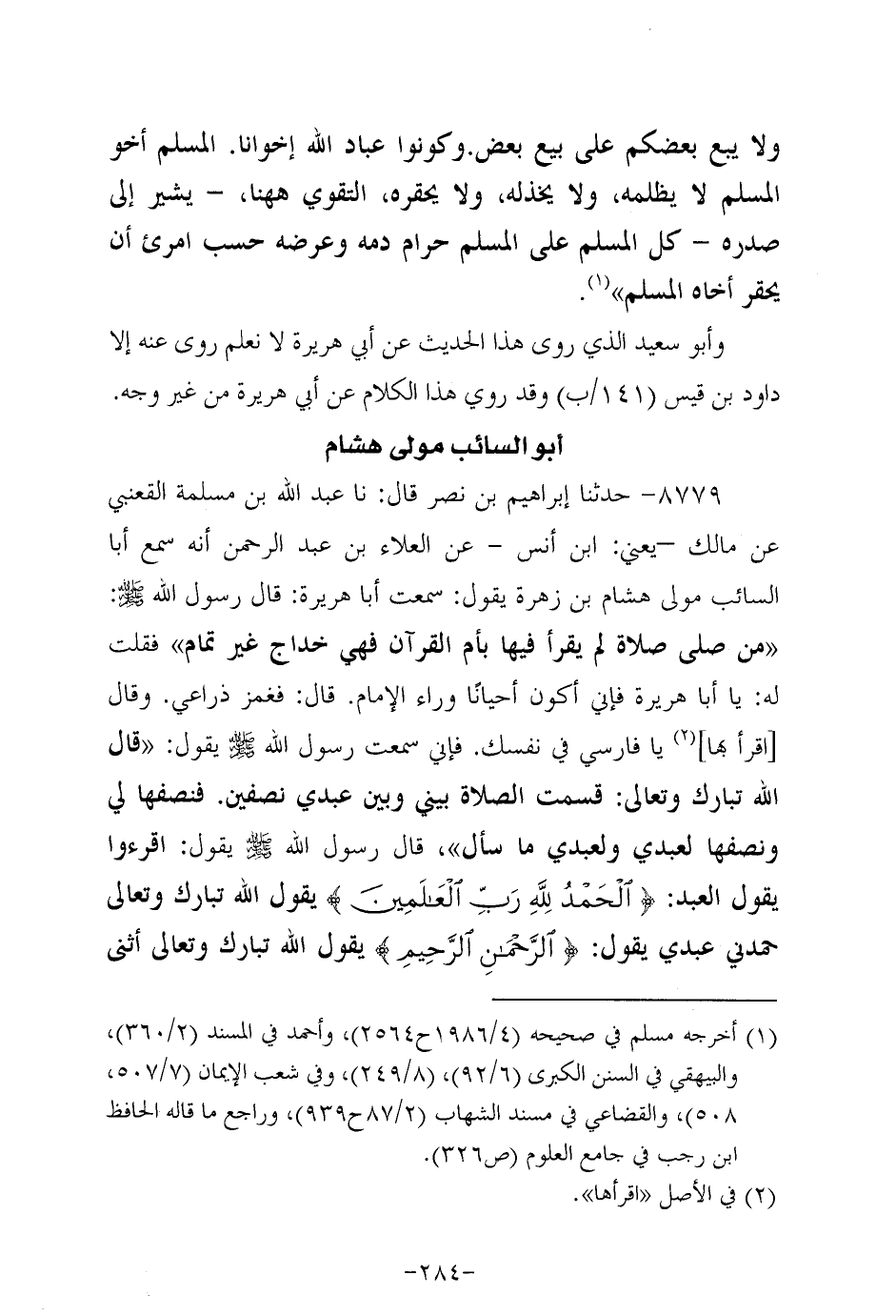 8779- حَدَّثنا إبراهيم بن نصر، قَال: حَدَّثنا عَبد الله بن مسلمة القعنبي، عَن مالك، يعني ابن أنس عَنِ الْعَلاءِ بْنِ عَبد الرَّحْمَنِ أَنَّهُ سَمِعَ أبا السائب مولى هشام بن زهرة يقول: سمعت أبا هُرَيرة: قَالَ رَسُول اللهِ صَلَّى اللَّهُ عَلَيه وَسَلَّم: من صلى صلاة لم يقرأ فيها بأم القرآن فهي خداج غير تمام فقلت له: يا أبا هُرَيرة فإني أكون أحيانا وراء الإمام قال: فغمز ذراعي، وَقال اقرأ بها يا فارسي في نفسك فَإِنِّي سَمِعْتُ رَسُولَ اللَّهِ صَلَّى اللَّهُ عَلَيه وَسَلَّم يقول: قال الله تبارك وتعالى: قسمت الصلاة بيني وبين عَبدي نصفين فنصفها لي ونصفها لعبدي ولعبدي ما سأل قَالَ رَسُول اللهِ صَلَّى اللَّهُ عَلَيه وَسَلَّم يقول: اقرؤوا يقول العبد {الحمد لله رب العلمين} يقول الله تبارك وتعالى حمدني عَبدي يقول {الرحمن الرحيم} يقول الله تبارك وتعالى أثنى علي عَبدي يقول العبد {ملك يوم الدين} يقول الله تبارك وتعالى مجدني عَبدي وهذه الآية بيني وبين عَبدي يقول العبد {إياك نعبد وإياك نستعين} فهذه بيني وبين عَبدي ولعبدي ما سأل يقول العبد {اهدنا الصراط المستقيم صراط الذين أنعمت عليهم غير المعضوب عليهم ولاَ الضالين} فهؤلاء لعبدي ولعبدي ما سأل