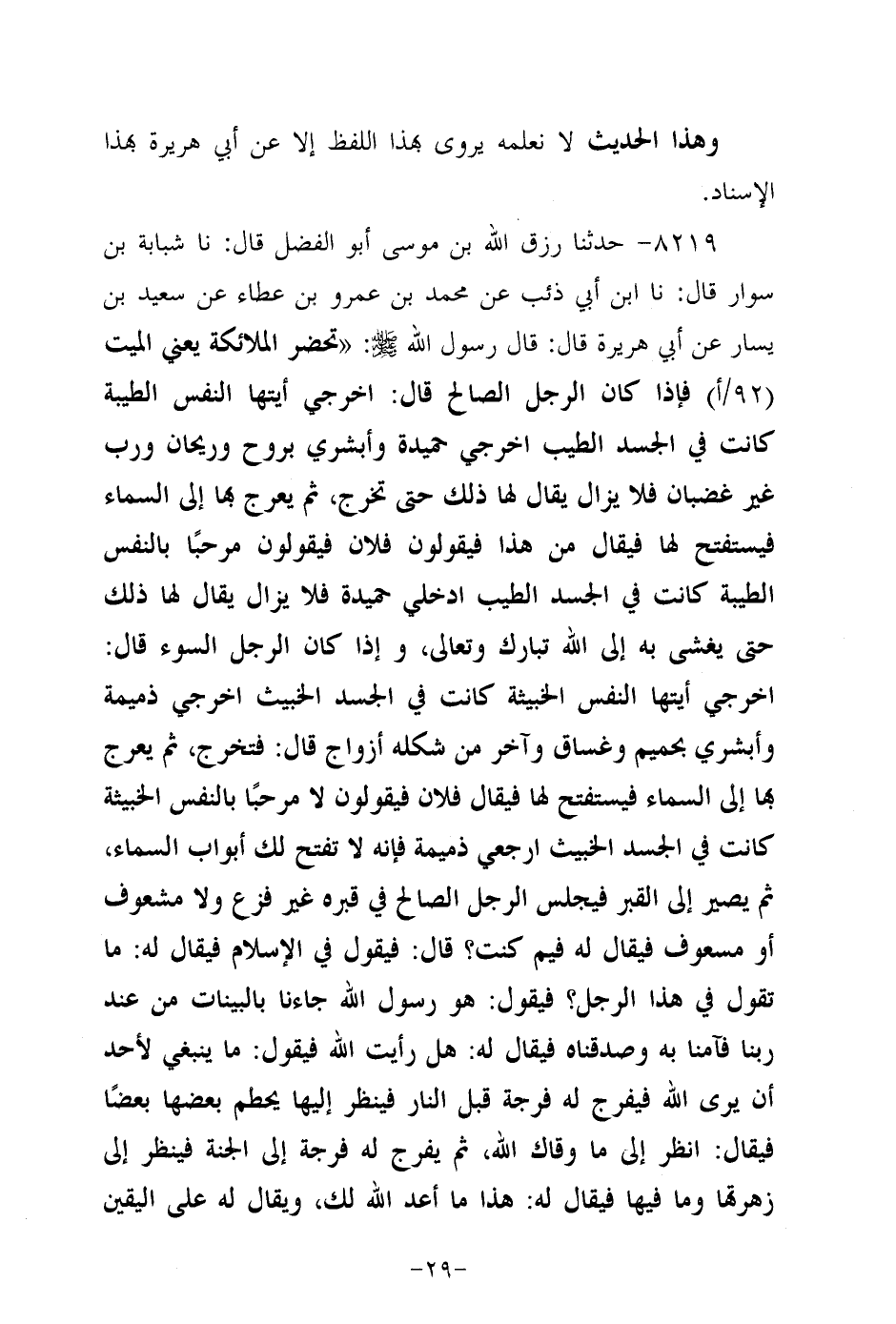 8219- حَدَّثنا رزق الله بن موسى أَبُو الفضل، قَال: حَدَّثنا شبابة بن سوار، قَال: حَدَّثنا ابن أبي ذِئب، عَن مُحَمد بن عَمْرو بن عطاء، عَن سَعِيد بن يسار، عَن أبي هُرَيرة، قَالَ: قَالَ رَسُول اللهِ صَلَّى اللَّهُ عَلَيه وَسَلَّم: تحضر الملائكة، يعني الميت فإذا كان الرجل الصالح قال: اخرجي أيتها النفس الطيبة كانت في الجسد الطيب اخرجي حميدة وأبشري بروح وريحان ورب غير غضبان فلا يزال يقال لها ذلك حتى تخرج، ثُمَّ يعرج بها إلى السماء فيستفتح لها فيقال من هذا فيقولون فلان فيقولون مرحبا بالنفس الطيبة كانت في الجسد الطيب ادخلي حميدة فلا يزال يقال لها ذلك حتى يغشى به إلى الله تبارك وتعالى ,