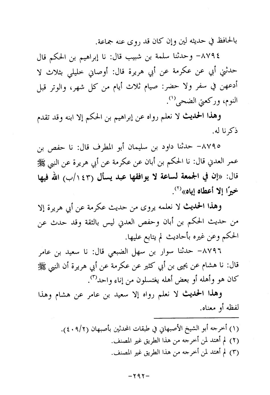 8795- حَدَّثنا دَاوُدُ بْنُ سُلَيْمان أَبُو الْمُطَرِّفِ، قَال: حَدَّثنا حفص بن عُمَر العدني، قَال: حَدَّثنا الحكم بن أَبَان عن عكرمة، عَن أَبِي هُرَيرة، عَن النَّبِيّ صَلَّى اللَّهُ عَلَيه وَسَلَّم قال: إن في الجمعة لساعة لا يوفقها عَبد يسأل الله فيها خيرا إلاَّ أعطاه إياه.
