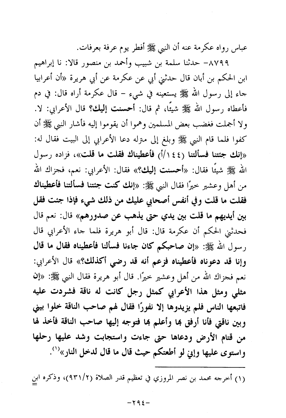 8799- حَدَّثنا سَلَمَةُ بْنُ شَبِيب، وَأحمد بْنُ مَنْصُورِ، قَالاَ: حَدَّثنَا إبراهيم بن الحكم بن أَبَان، قَال: حَدَّثني أبي عن عكرمة، عَن أبي هُرَيرة؛ أن أعرابيا جَاءَ إِلَى النَّبِيّ صَلَّى اللَّهُ عَلَيه وَسَلَّم يستعينه في شيء قال عكرمة أراه قال: في دم فأعطاه رسول الله صَلَّى الله عَلَيه وَسَلَّم شيئا، ثُمَّ قال: أحسنت إليك؟ قال الأعرابي: لا، ولاَ أجملت فغضب بعض المسلمين وهموا أن يقوموا إليه فأشار النَّبِيّ صَلَّى الله عَلَيه وَسَلَّم أن كفوا فلما قام النَّبِيّ صَلَّى الله عَلَيه وَسَلَّم وبلغ إلى منزله دعا الأعرابي إلى البيت فقال له: إنك جئتنا فسألتنا فأعطيناك فقلت ما قلت فزاده رسول الله صَلَّى الله عَلَيه وَسَلَّم شيئا فقال: أحسنت إليك؟ فقال الأعرابي: نعم فجزاك الله من أهل وعشير خيرا.