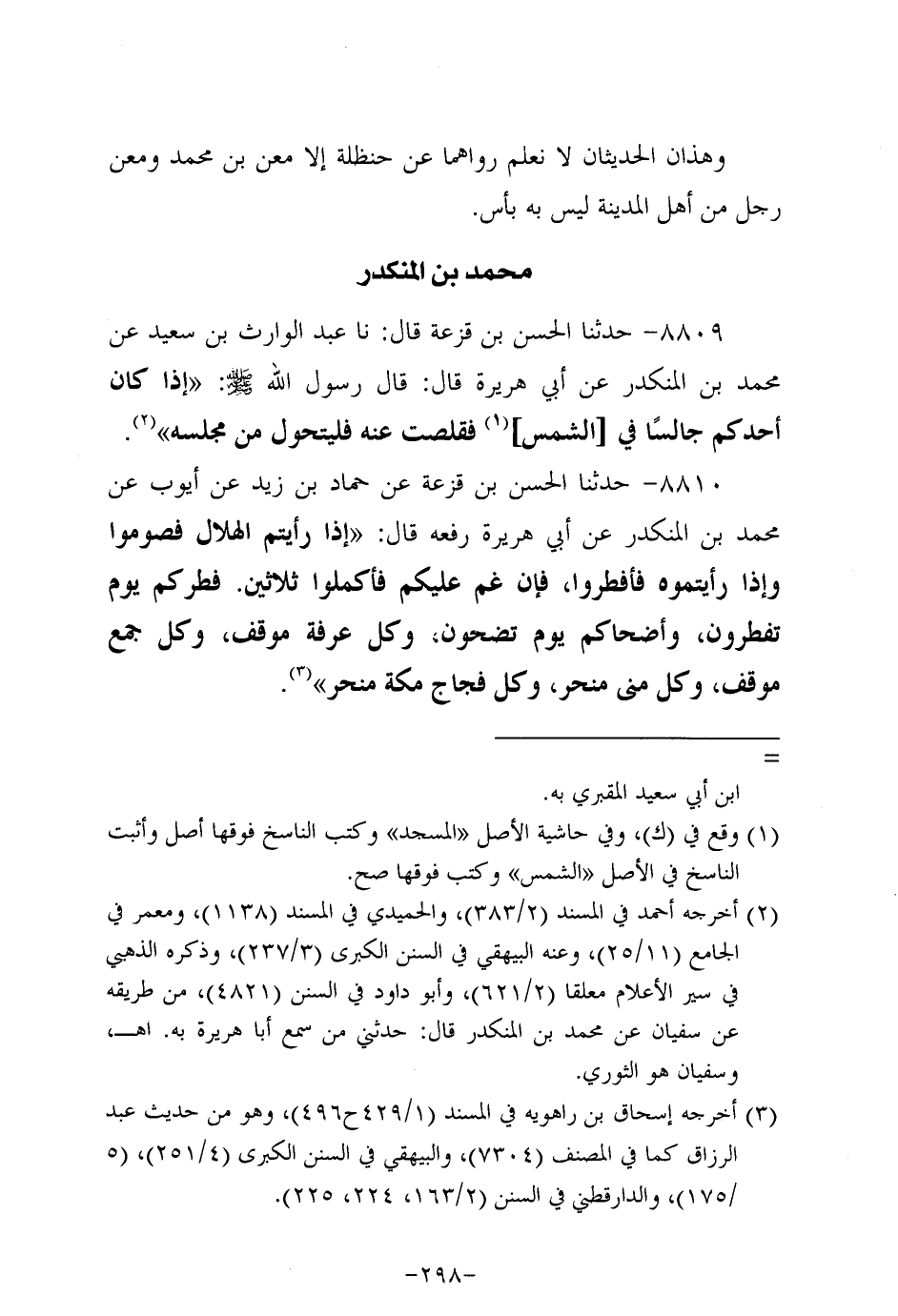 8810- حَدَّثنا الحسن بن قزعة عن حَمَّادُ بْنُ زَيْدٍ، عَن أَيُّوبَ عَنْ مُحَمد بن المنكدر، عَن أبي هُرَيرة رفعه قال: إذا رأيتم الهلال فصوموا، وإذا رأيتموه فأفطروا فإن غم عليكم فأكملوا ثلاثين فطركم يوم تفطرون وأضحاكم يوم تضحون وكل عرفة موقف وكل جمع موقف وكل منى منحر وكل فجاج مكة منحر.
