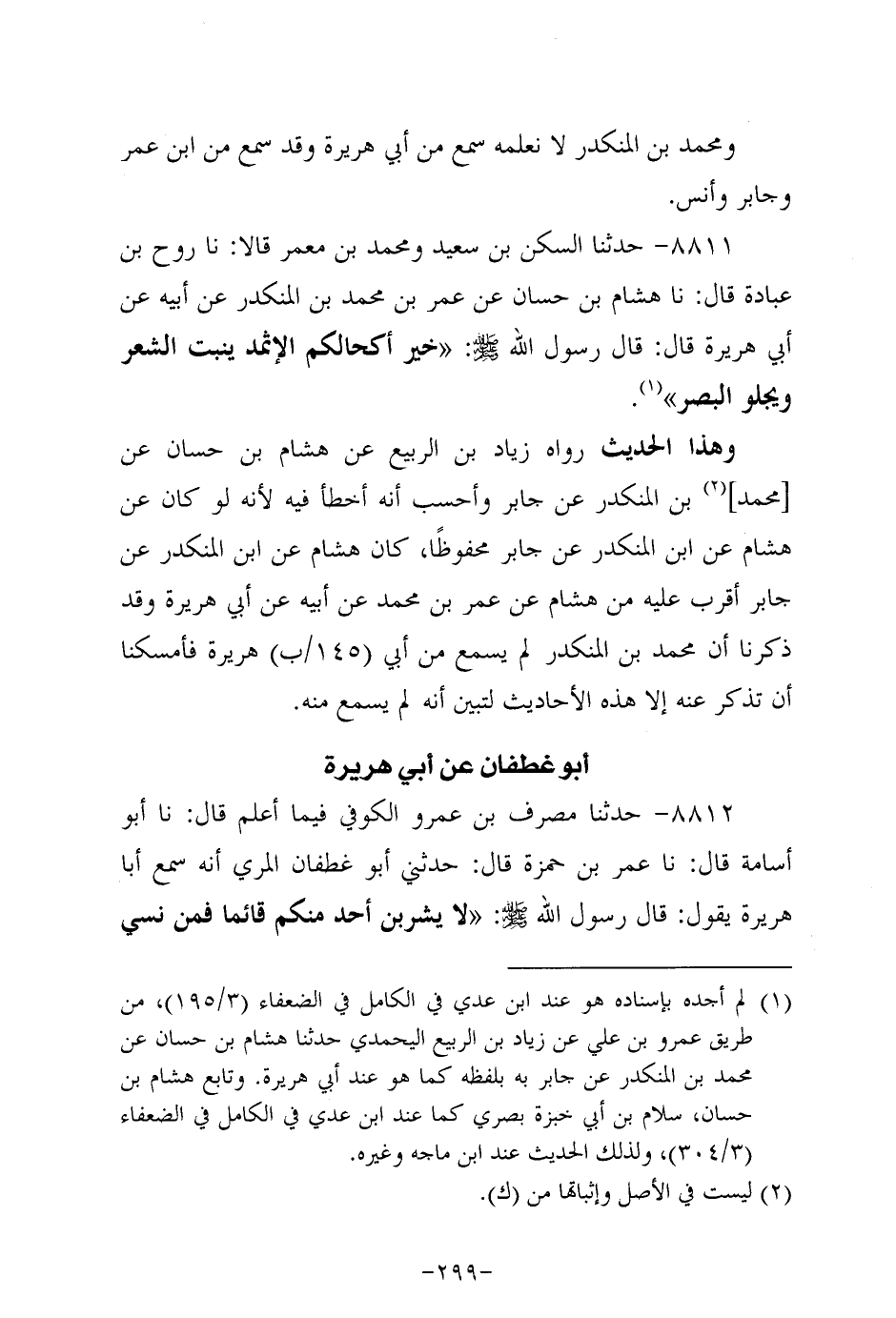 8811- حَدَّثنا السكن بن سَعِيد، ومُحَمد بن مَعْمَر، قَالاَ: حَدَّثنَا روح بن عبادة، قَال: حَدَّثنا هشام بن حسان عن عُمَر بن مُحَمد بن المنكدر، عَن أَبِيه، عَن أبي هُرَيرة، قَالَ: قَالَ رَسُول اللهِ صَلَّى اللَّهُ عَلَيه وَسَلَّم: خير أكحالكم الإثمد ينبت الشعر ويجلوا البصر.
