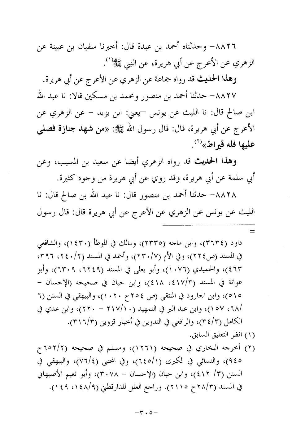 8827- حَدَّثنا أحمد بن منصور، ومُحَمد بن مسكين، قَالاَ: حَدَّثنَا عَبد الله بن صالح، قَال: حَدَّثنا اللَّيْث عن يونس، يعني ابن يزيد، عَن الزُّهْرِيّ، عَن الأَعرَج، عَن أبي هُرَيرة، قَالَ: قَالَ رَسُول اللهِ صَلَّى اللَّهُ عَلَيه وَسَلَّم: من شهد جنازة فصلى عليها فله قيراط.