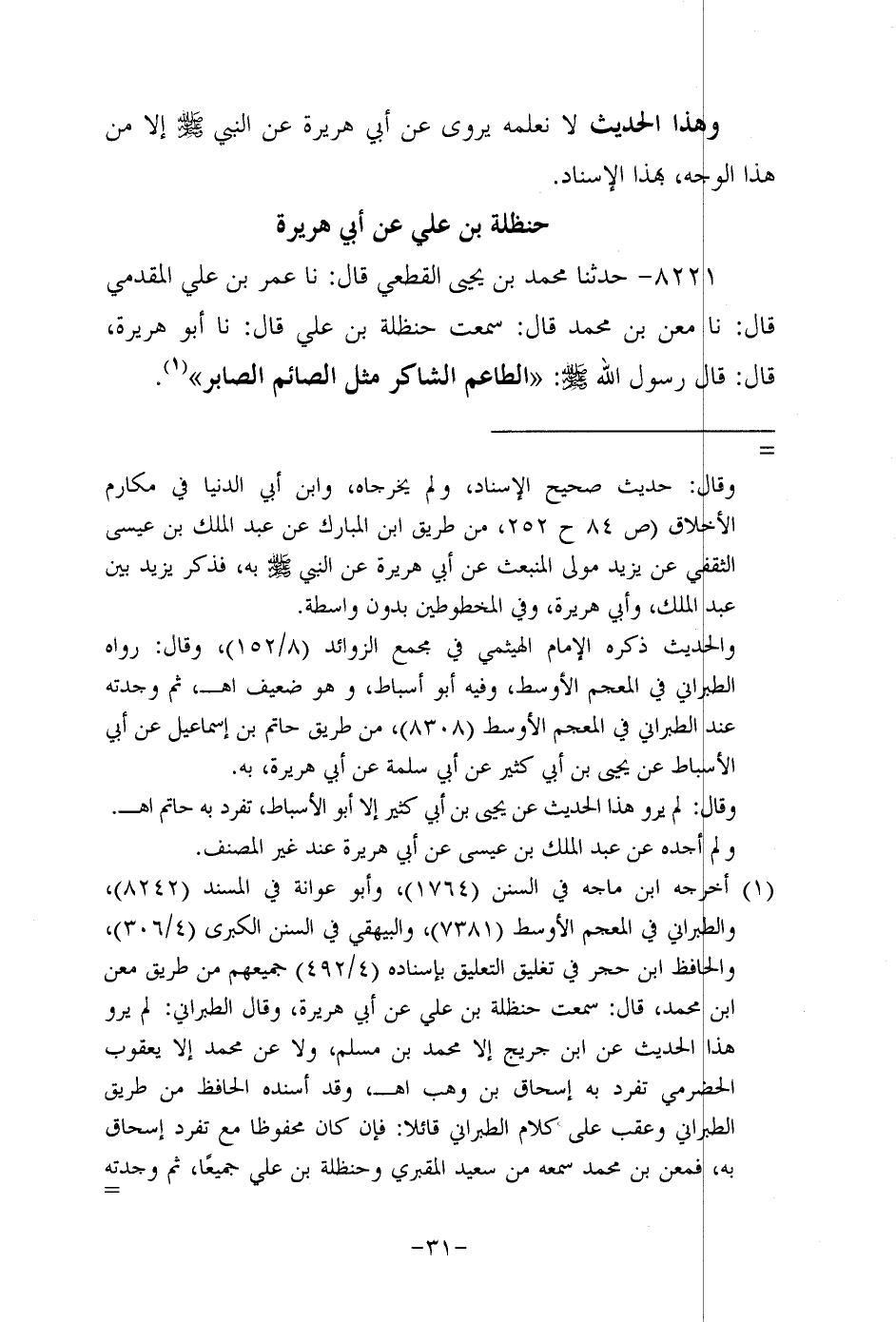 8221- حَدَّثنا مُحَمد بن يحيى القطعي، قَال: حَدَّثنا عُمَر بن علي المقدمي، قَال: حَدَّثنا معن بن مُحَمد، قال: سَمِعْتُ حنظلة بن علي، قَال: حَدَّثنا أَبُو هُرَيرة قَالَ: قَالَ رَسُول اللهِ صَلَّى اللَّهُ عَلَيه وَسَلَّم: الطاعم الشاكر مثل الصائم الصابر.