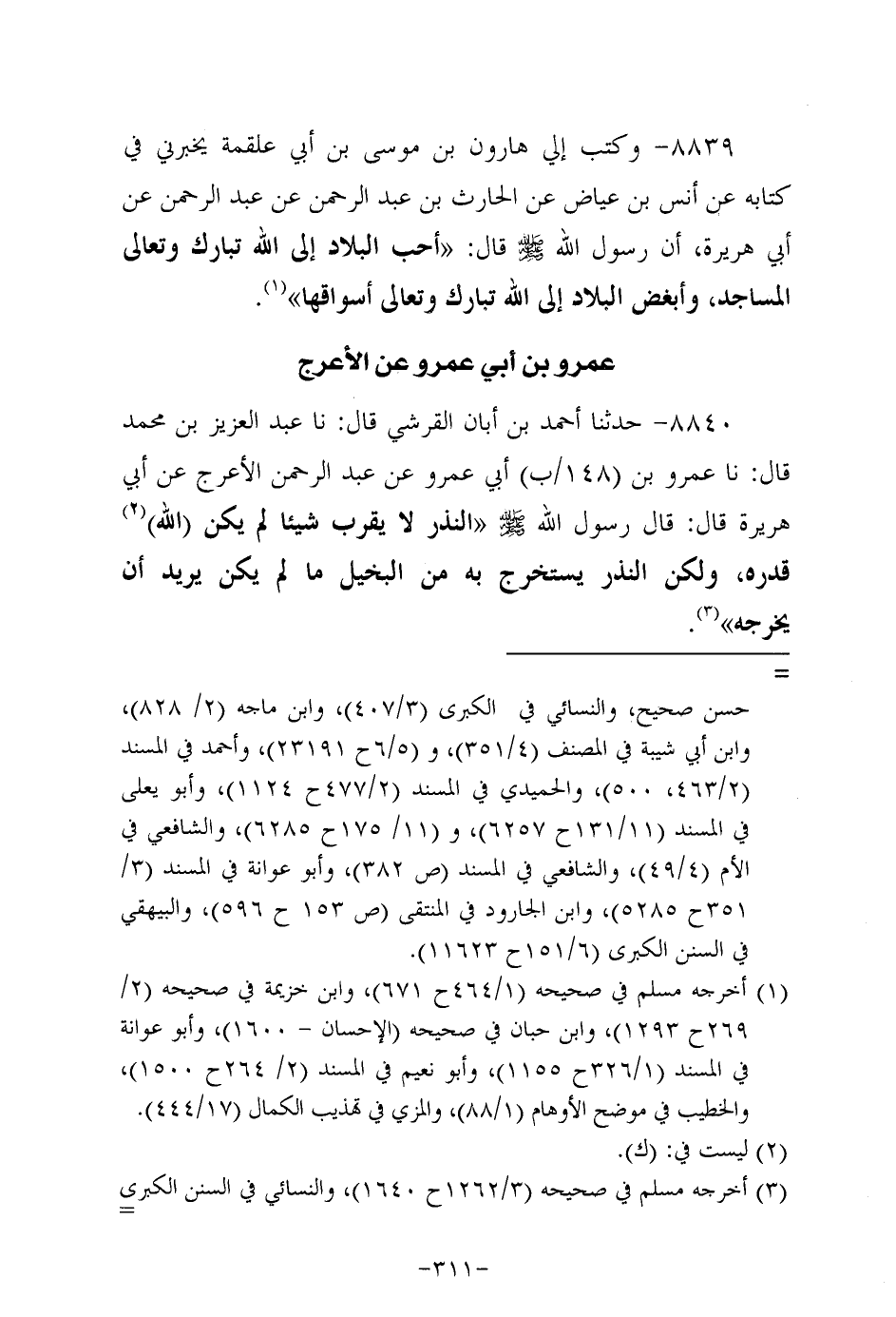8839- وكتب هارون بن موسى بن أبي علقمة يخبرني في كتابه، عَن أَنَس بن عياض عن الحارث بن عَبد الرَّحمَن، عَن عَبد الرحمن، عَن أبي هُرَيرة؛ أَنَّ رَسُولَ اللهِ صَلَّى اللَّهُ عَلَيه وَسَلَّم قال: أحب البلاد إلى الله تبارك وتعالى المساجد وأبغض البلاد إلى الله تبارك وتعالى أسواقها.